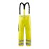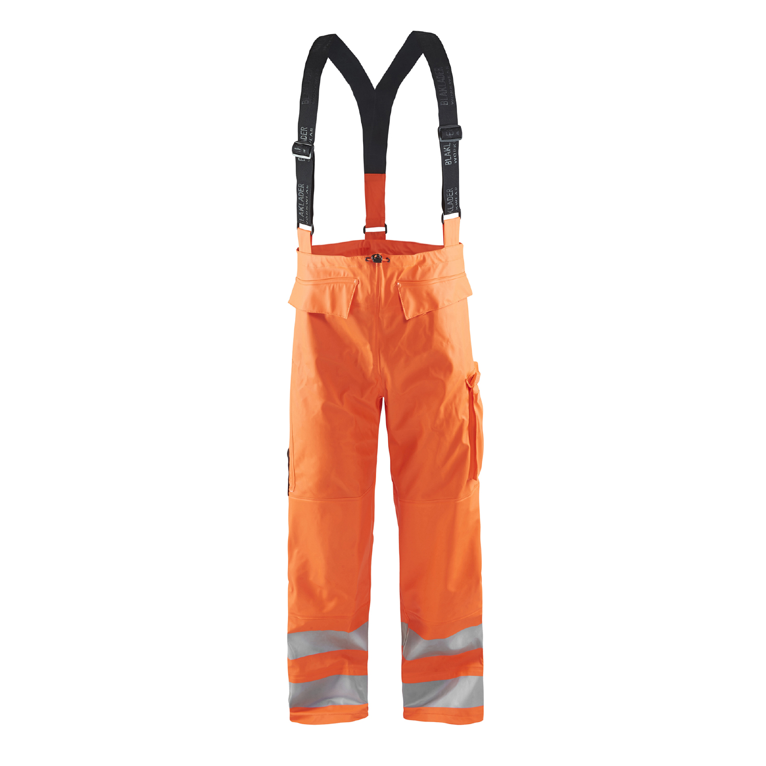 Regnbyxa från Blåkläder i varsel som är designad för tuffa arbetsuppgifter i extrema väderförhållanden. Tillverkad i slitstarkt och kraftigt material men är ändå smidig och bekväm att bära utanpå de ordinarie arbetskläderna. Byxan har resår baktill och justerbara benavslut med knäppning gör det enkelt att dra av och på byxorna utanpå stövlarna. Förstärkningar på knä och i benens nederkant för extra hållbarhet.