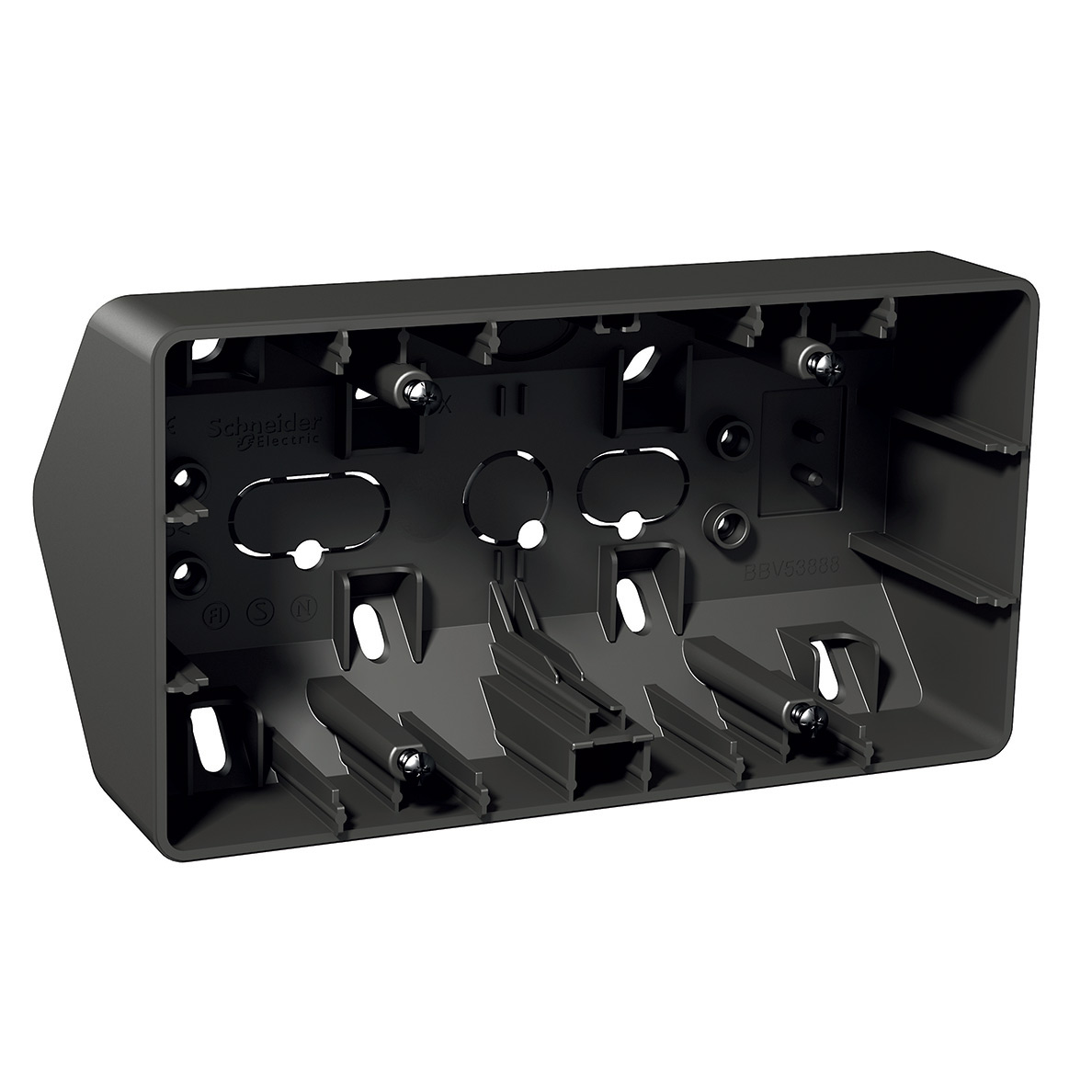 Exxact Hörnbox 2-fack från Schneider Electrics för utanpåliggande montage i hörn- eller underskåp. För montage av två valfria produkter ur Exxact-sortimentet. Anslutning bakifrån eller från kortsidorna. Kompletteras med en valfri Exxact-ram 2-fack.