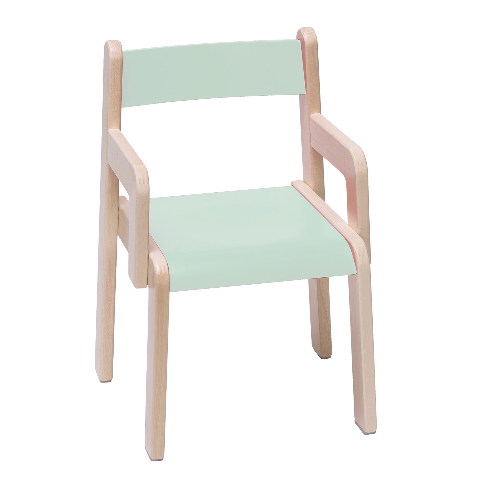Barnstol Timmi från ABA Skol. Tillverkad i massiv bok med formspänd sits och rygg med armstöd. Sitsen har rundad kant framtill. Det finns inga spikar eller skruvar i sits och rygg. Stapelbar. Plasttass medföljer.