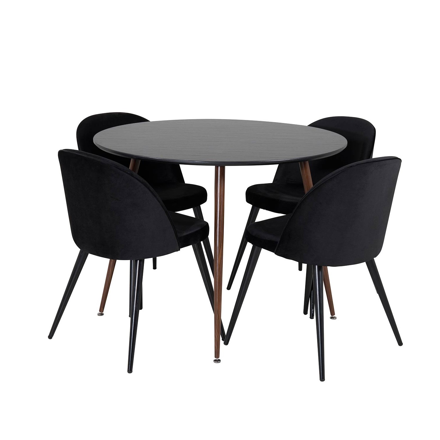 Matgrupp Plake med 4 Valentina Stolar Sammet Runt från Venture Home är en elegant matgrupp med ett runt matbord med ben i metall och en bordsskiva av MDF. Det medföljer fyra matstolar med svarta stolsben i metall och sitsar i sammet.