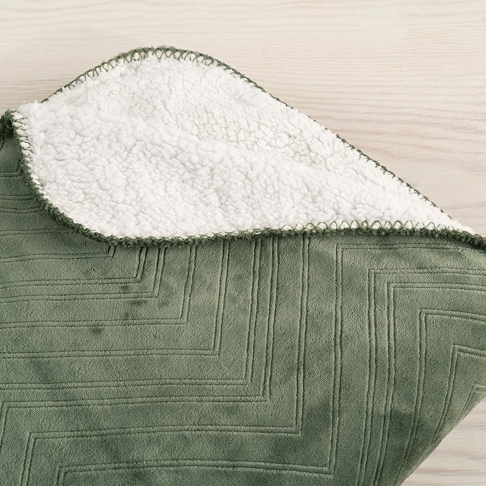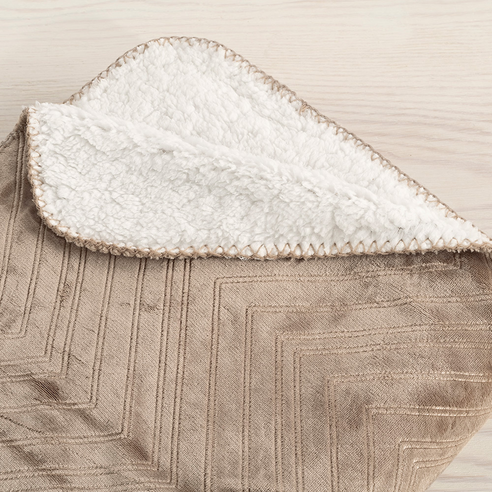 En mjuk pläd tillverkad av 100% polyester med härlig velour på framsidan och fluffig sherpa på baksidan, perfekt att svepa om sig i soffan. Pläden har dekorativa sömmar på kanterna och ett fint zig zag mönster på framsidan. Måtten på pläden är 130x170 cm.