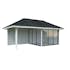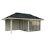 Tillverkad av nordisk gran med 120x120 mm starka limträstolpar och 19 mm takbrädor. Låsbara skjutdörrarna i 4 mm härdat glas och aluminium. 28 mm väggstockar.