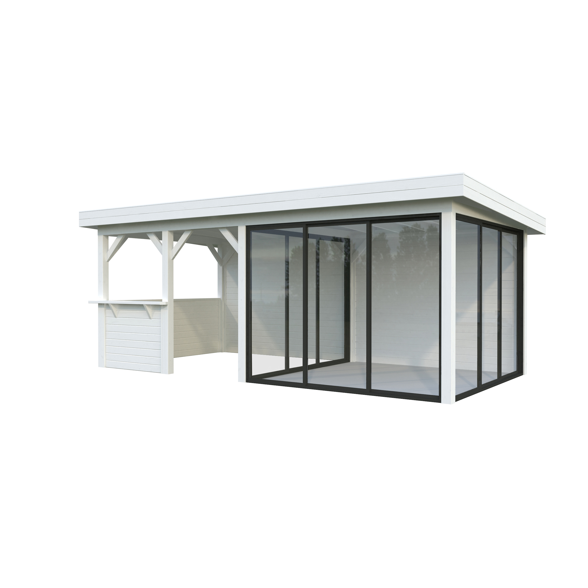 Tillverkad av nordisk gran med 120x120 mm starka limträstolpar och 19 mm takbrädor. Låsbara skjutdörrarna i 4 mm härdat glas och aluminium. 28 mm väggstockar.