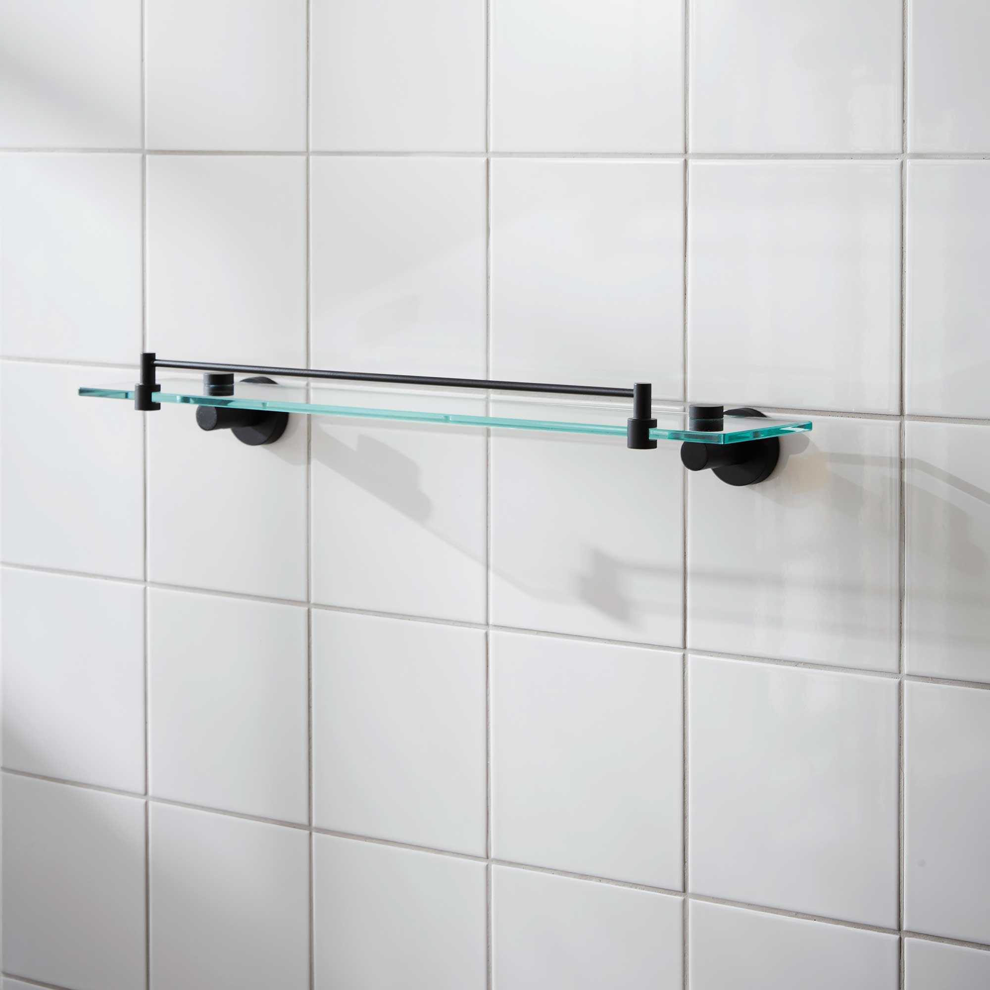 Glashylla av härdat klarglas med räcke. Väggplattans diameter är 45 mm. Serien Bond finns i olika utföranden.