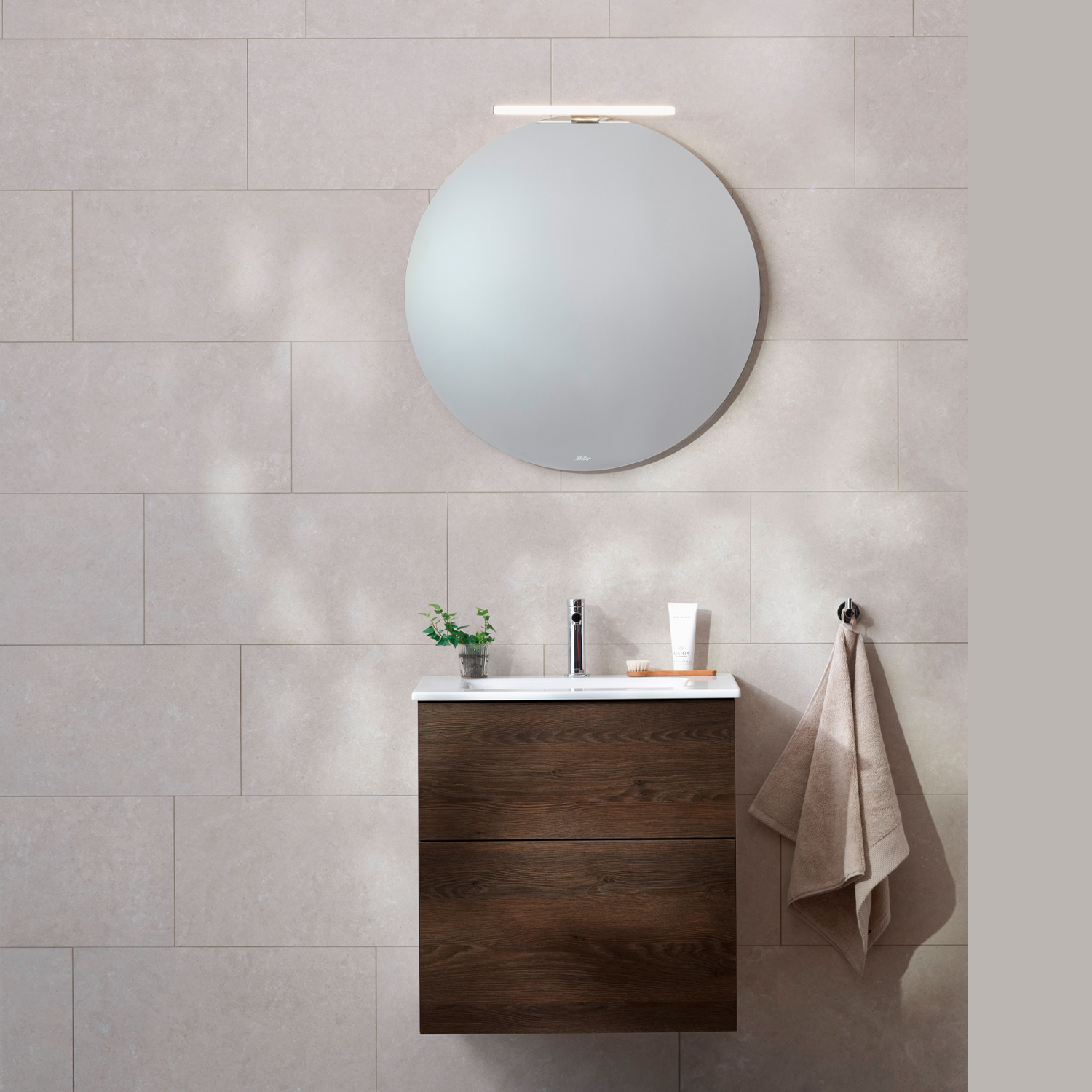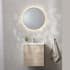 Möbelpaket från Miller Badrum med kommod, tvättställ och rund spegel med dimbart indirekt ljus.