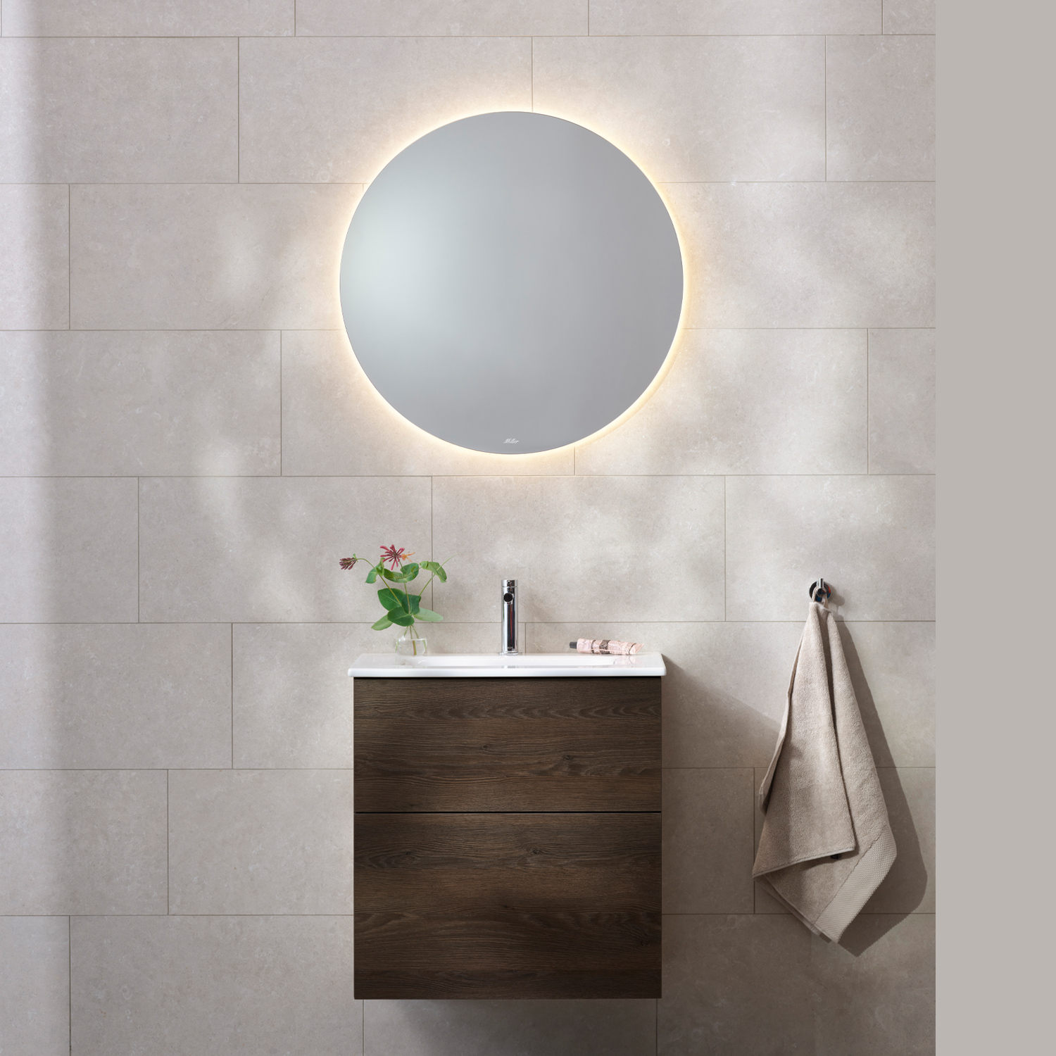 Möbelpaket från Miller Badrum med kommod, tvättställ och rund spegel med toppbelysning.