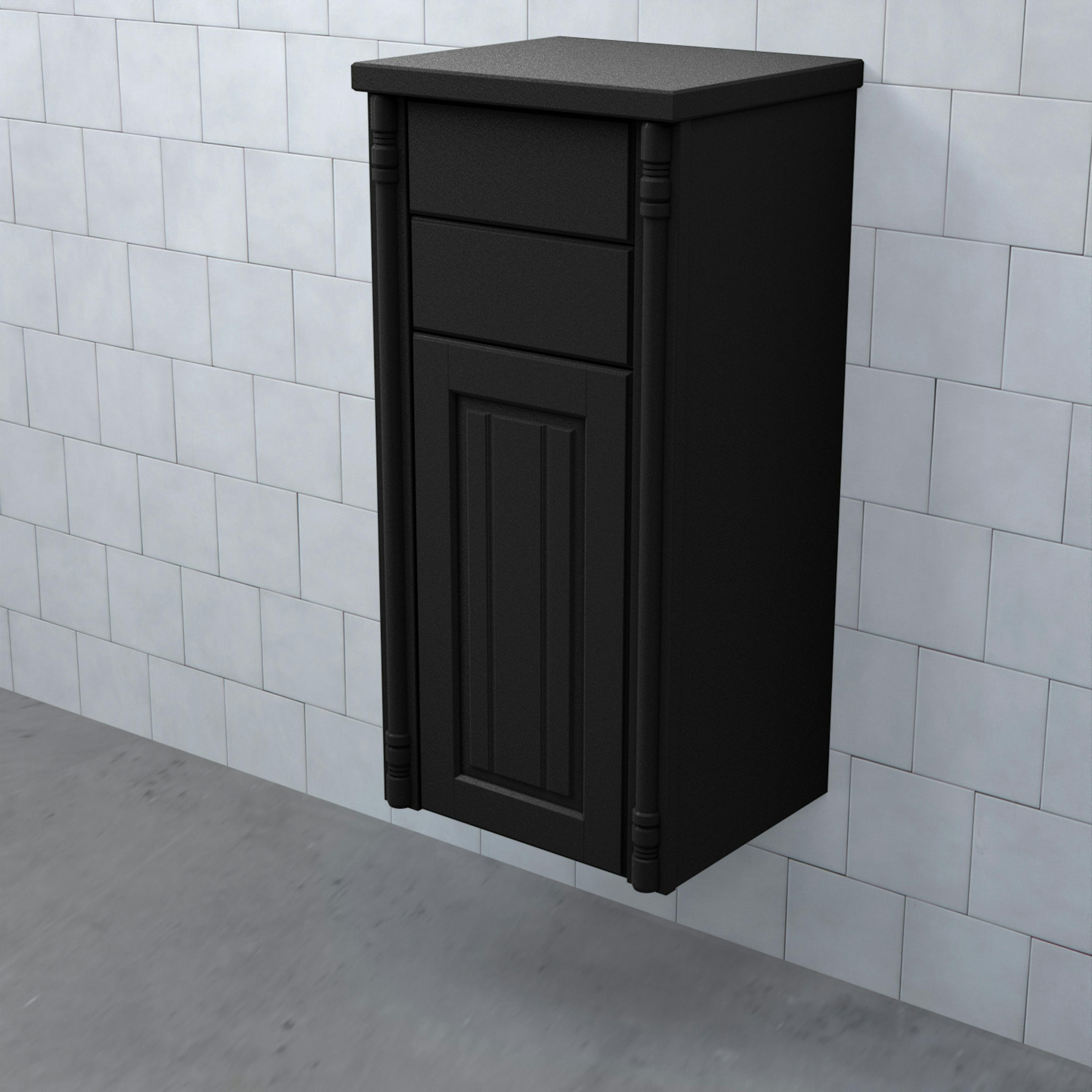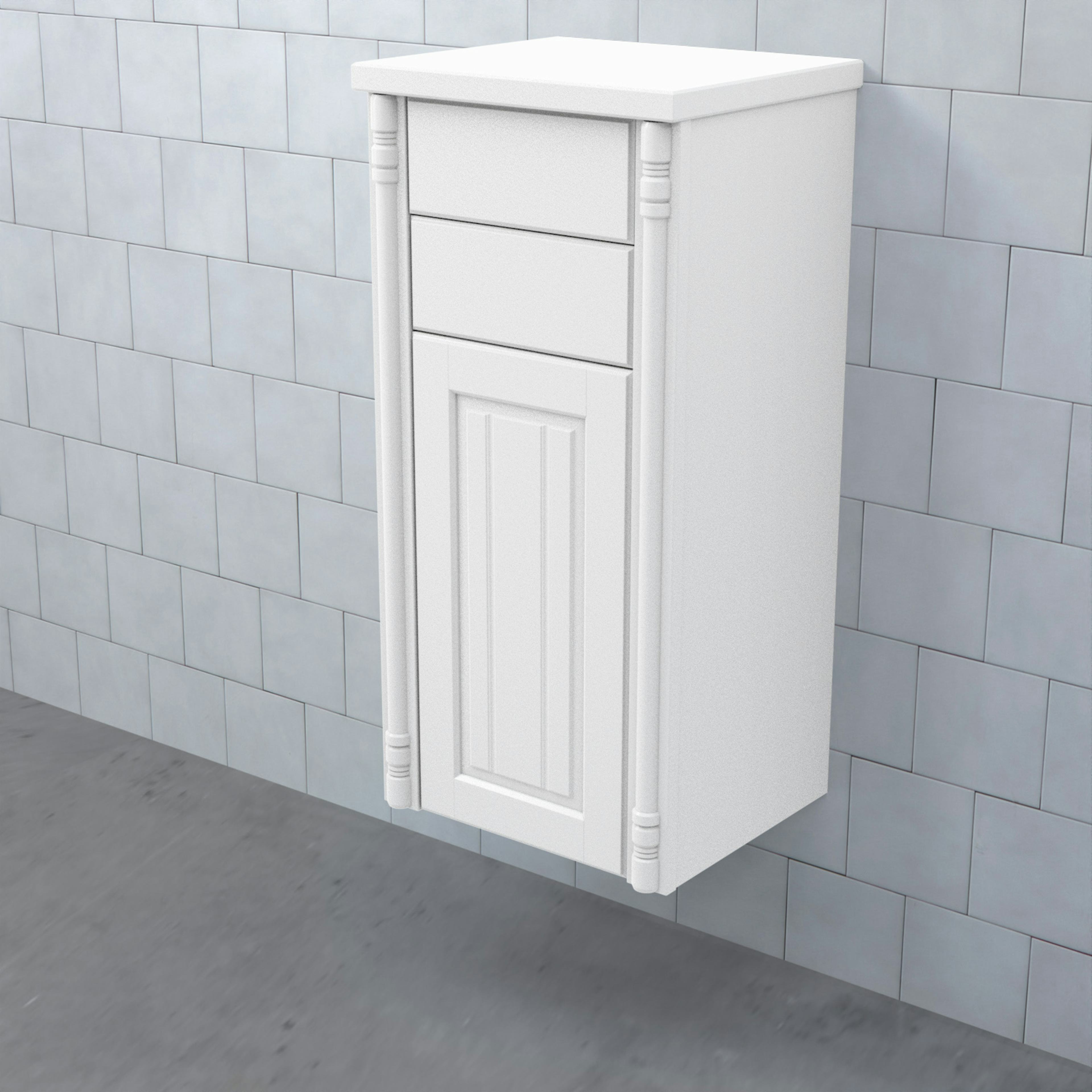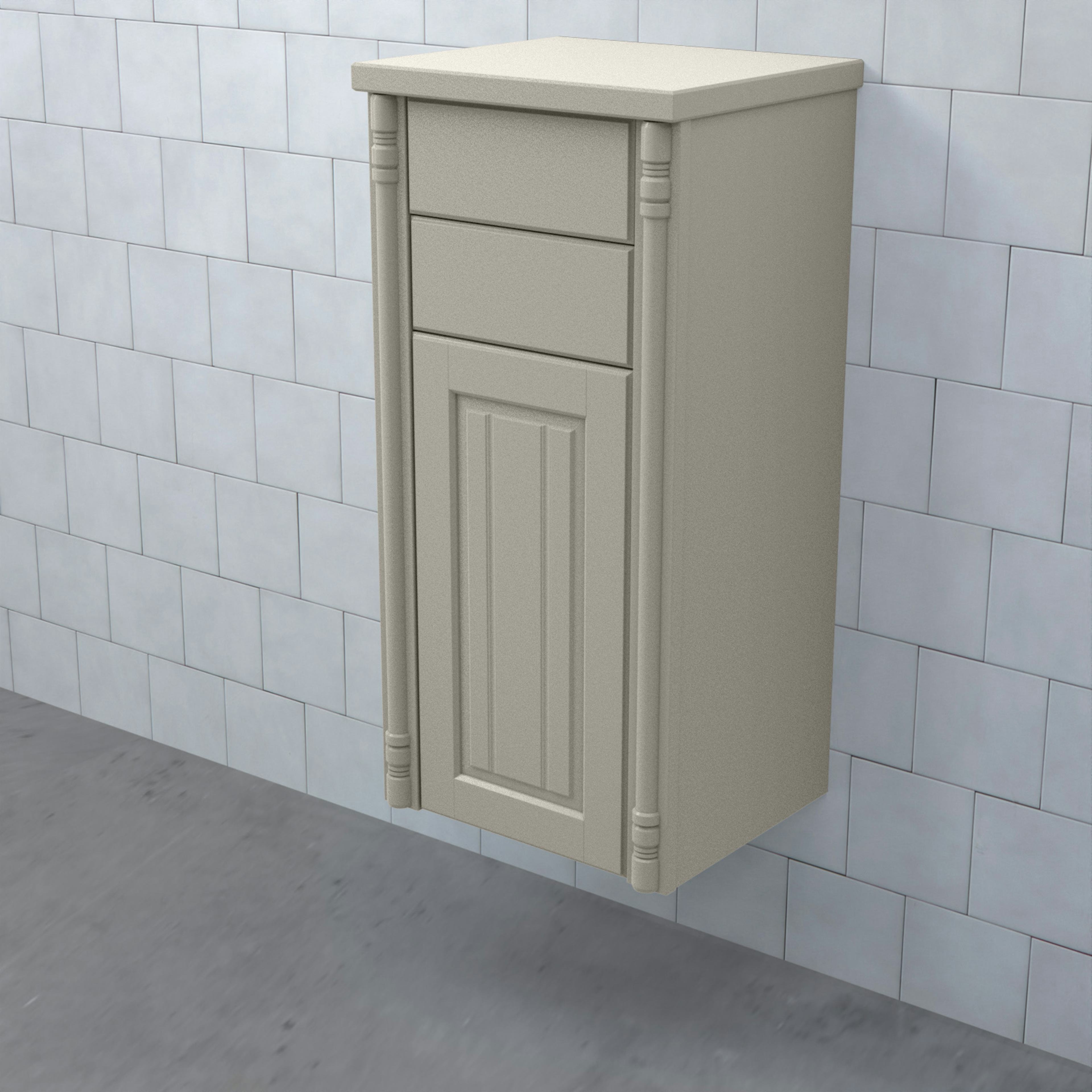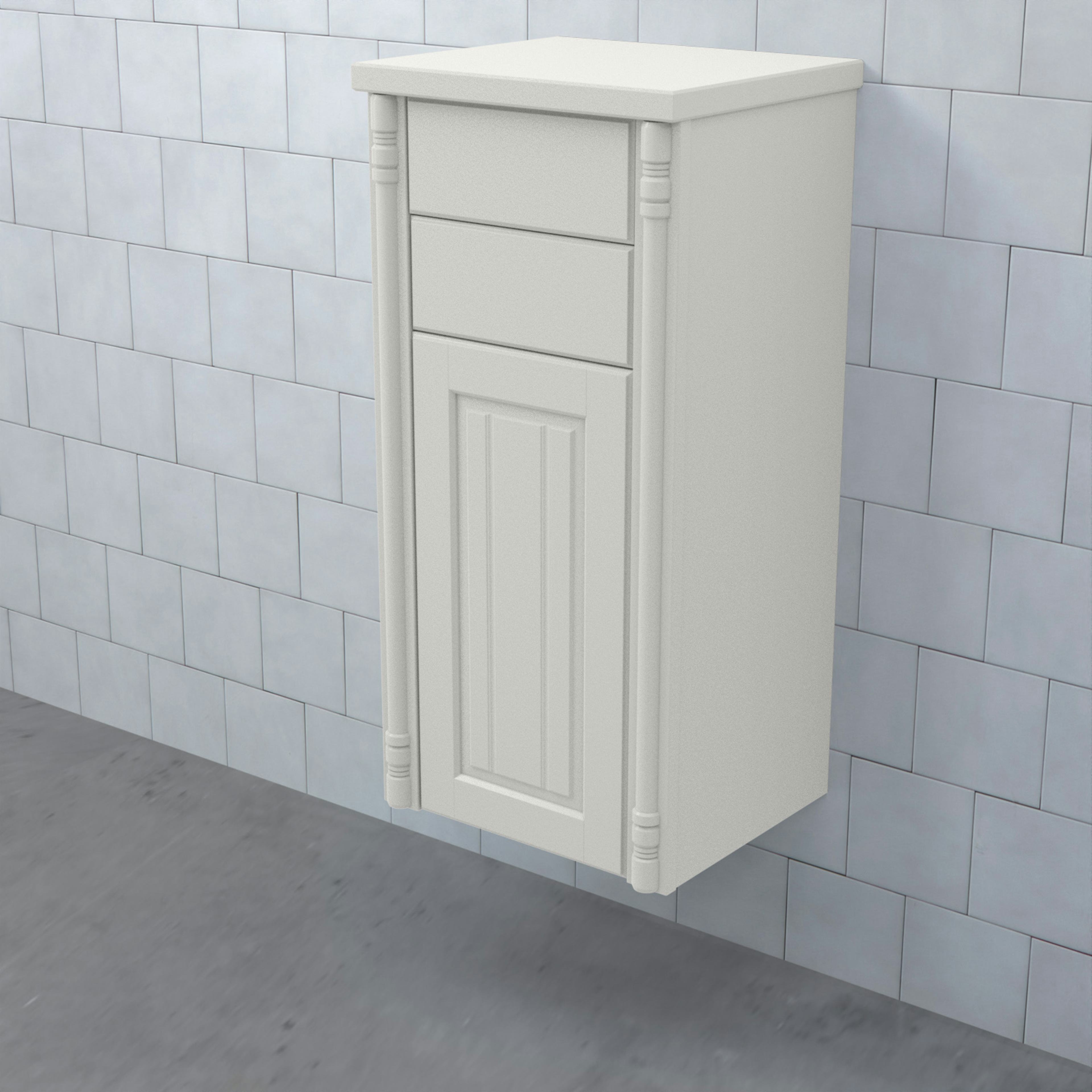 Halvhögt Skåp Valhall med Lucka och 2 Lådor från Björbo Badrum är ett stilren badrumsskåp med romantiska sekelskiftesinslag. Detta praktiska skåp har två fullutdragslådor med dämpning och självindrag och en lucka. Hyllplanet har samma färg som skåpet.