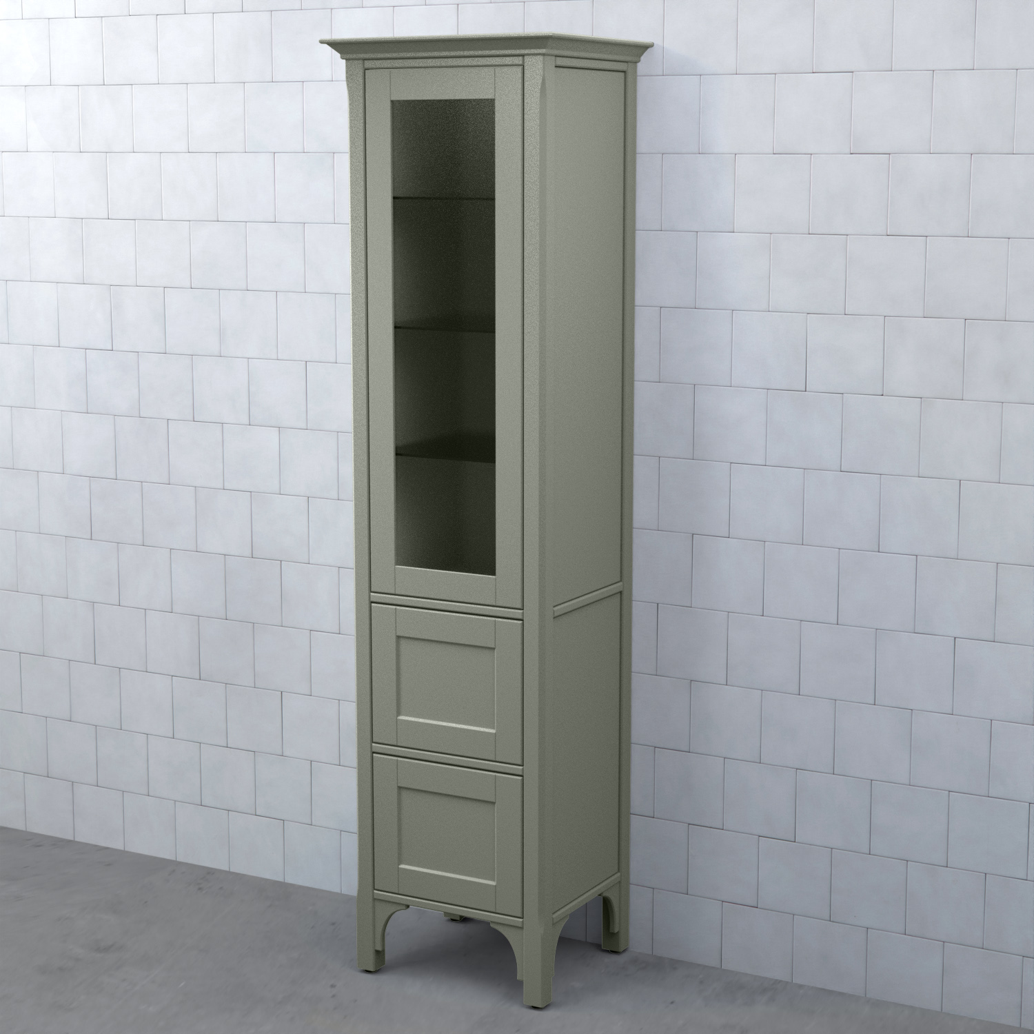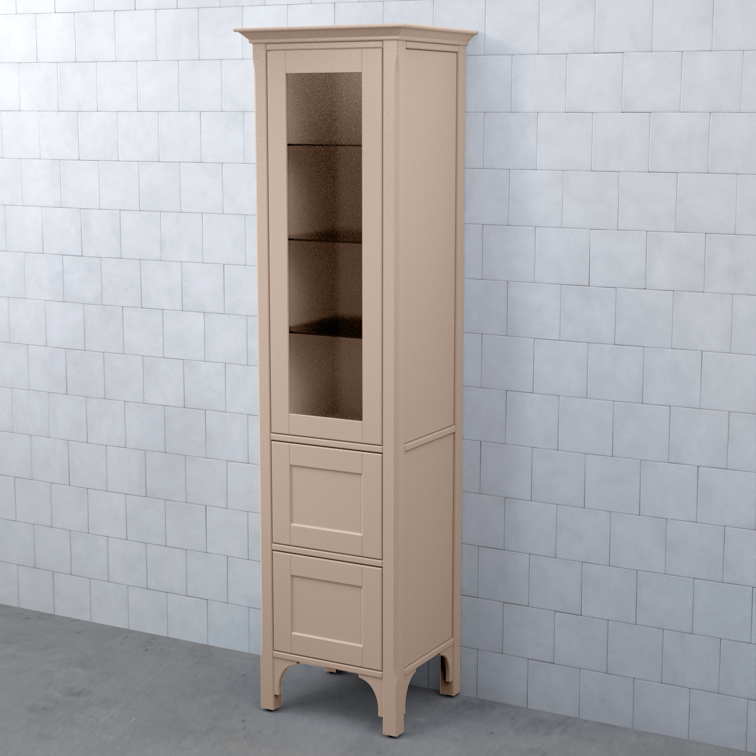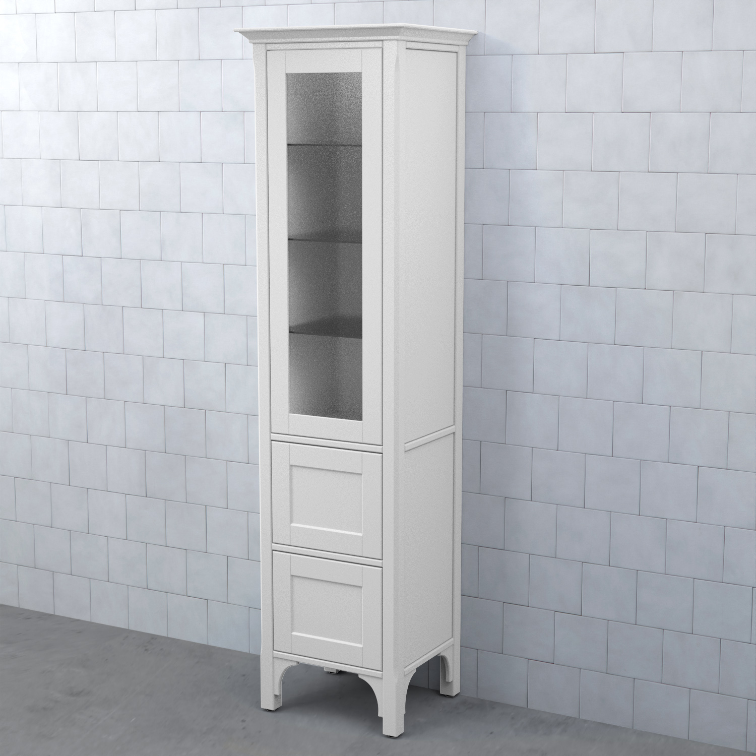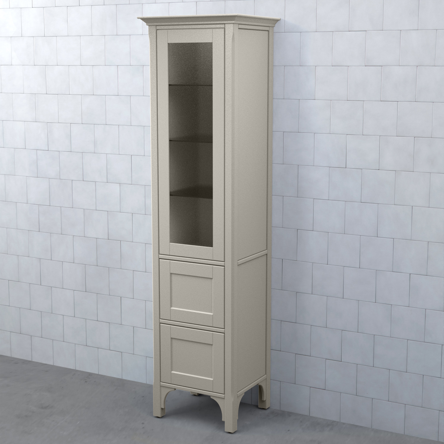 Högskåp Saga Vitrinlucka från Björbo Badrum är ett klassiskt högskåp i romantisk stil. Skåpet har en vitrinlucka på övre delen och två djupa och mycket stabila fullutdragslådor i svartbetsat trä med mjukstängning och självindrag längst ner. Stommen är gjord av målad MDF och skåpet har glashyllor invändigt.