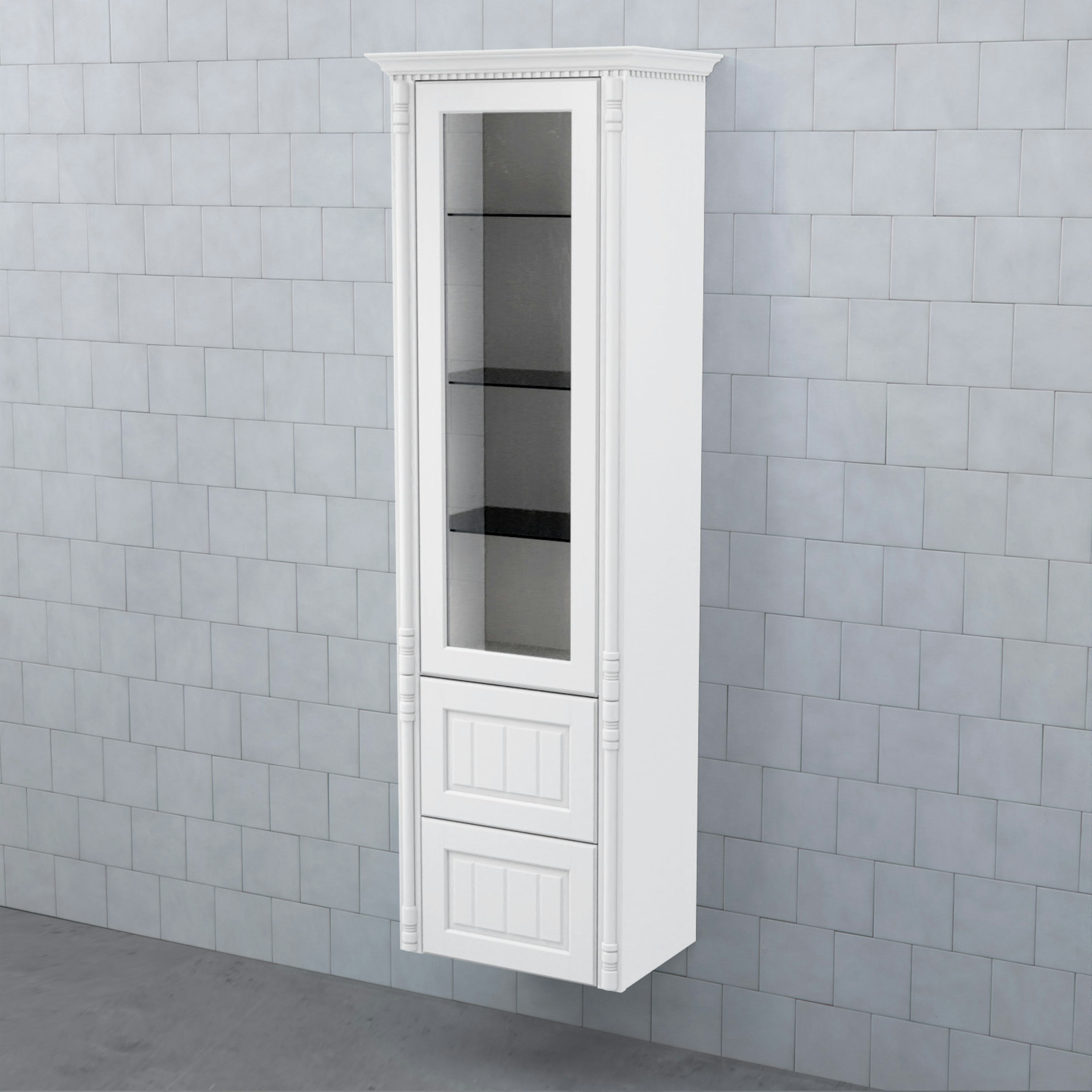 Högskåp Valhall Vitrinlucka med Två Lådor från Björbo Badrum är ett stilrent badrumsskåp med en vitrinlucka i övre delen av skåpet och två lådor i nederdelen. Lådorna är stabila fullutdraglådor med dämpning och självindrag. Detta skåp har en tandad krönlist och pelare som stilfullt ramar in möbeln. Stommen är gjord av målad MDF med vackra ramluckor med utfrästa spår.