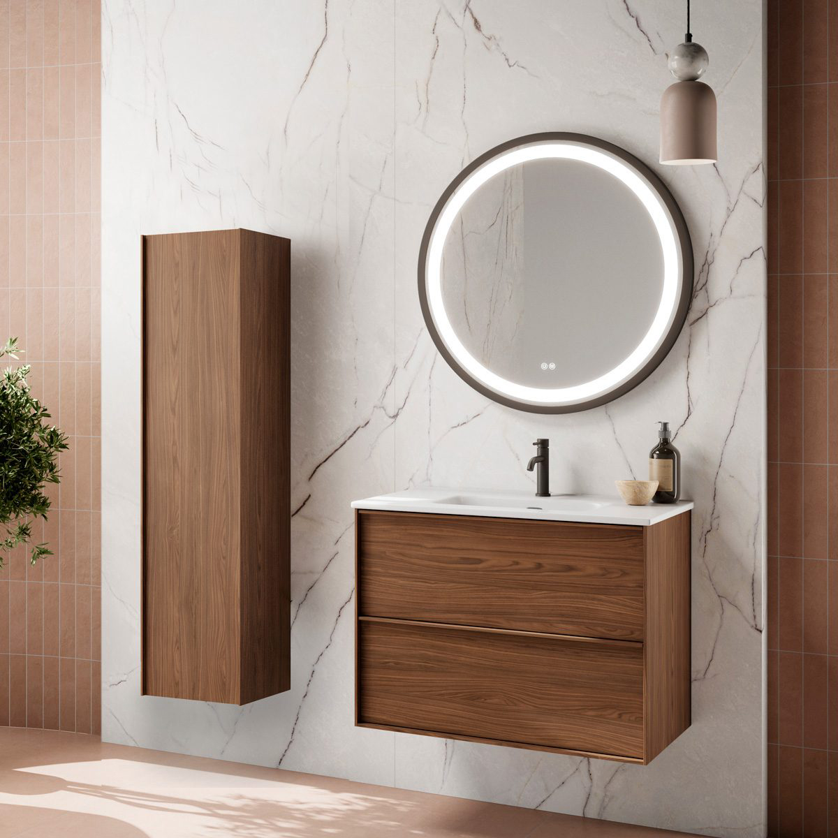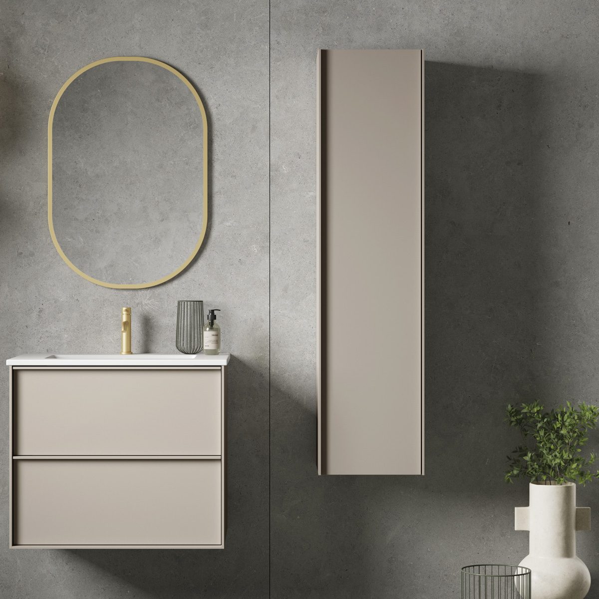 Högskåpen i serien mäter 35x140 cm och har ett djup på 35 cm, vilket gör dem perfekta för både små och stora badrum. De erbjuder rymliga hyllplan och mjukstängande dörrar, vilket ger praktisk och flexibel förvaring för handdukar och andra badrumstillbehör. Den dolda upphängningen ger en minimalistisk och svävande effekt, vilket underlättar rengöring och bidrar till en luftig känsla.