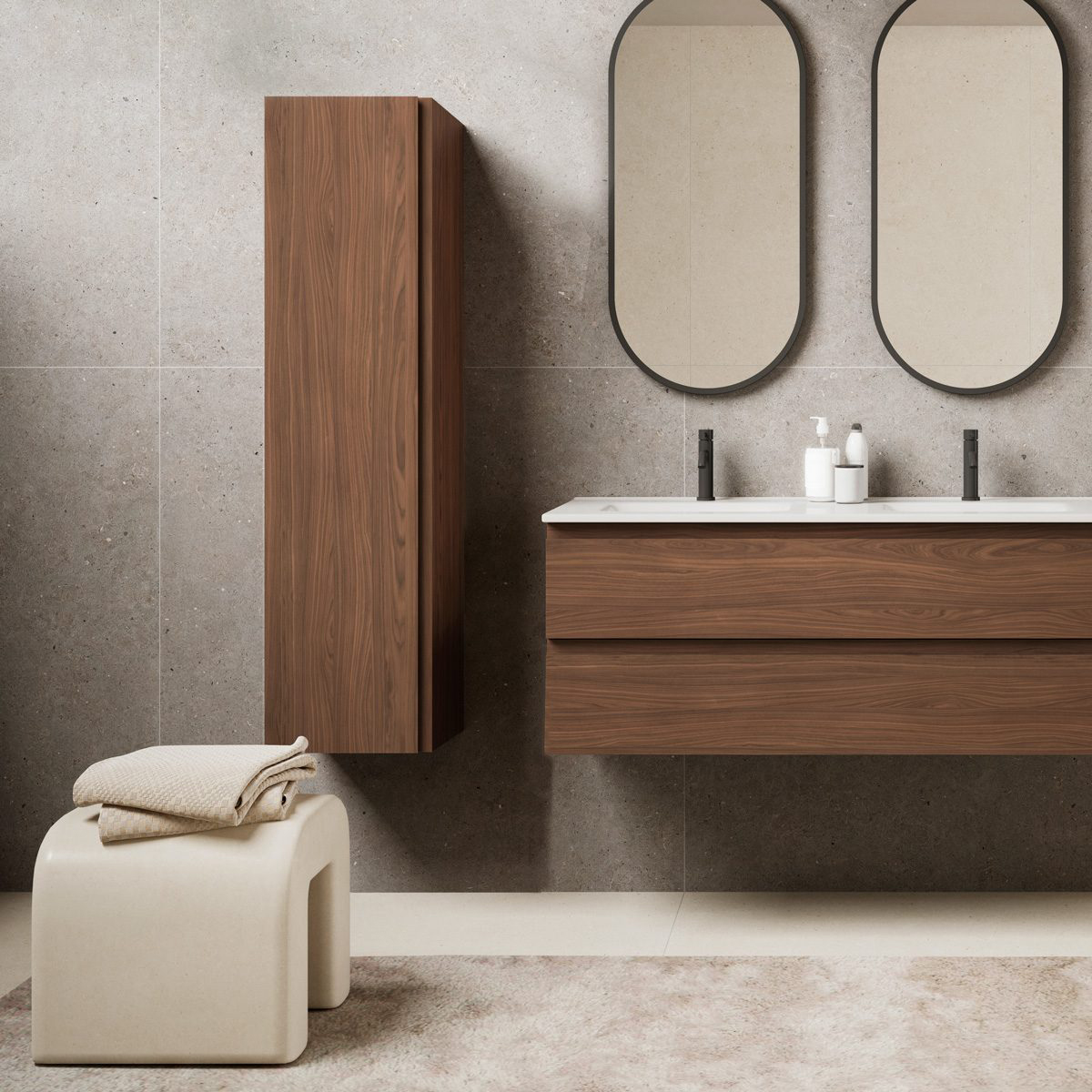 Högskåpen i serien mäter 35x140 cm och har ett djup på 35 cm, vilket gör dem perfekta för både små och stora badrum. De erbjuder rymliga hyllplan i glas och mjukstängande dörrar, vilket ger praktisk och flexibel förvaring för handdukar och andra badrumstillbehör. Den dolda upphängningen ger en minimalistisk och svävande effekt, vilket underlättar rengöring och bidrar till en luftig känsla.