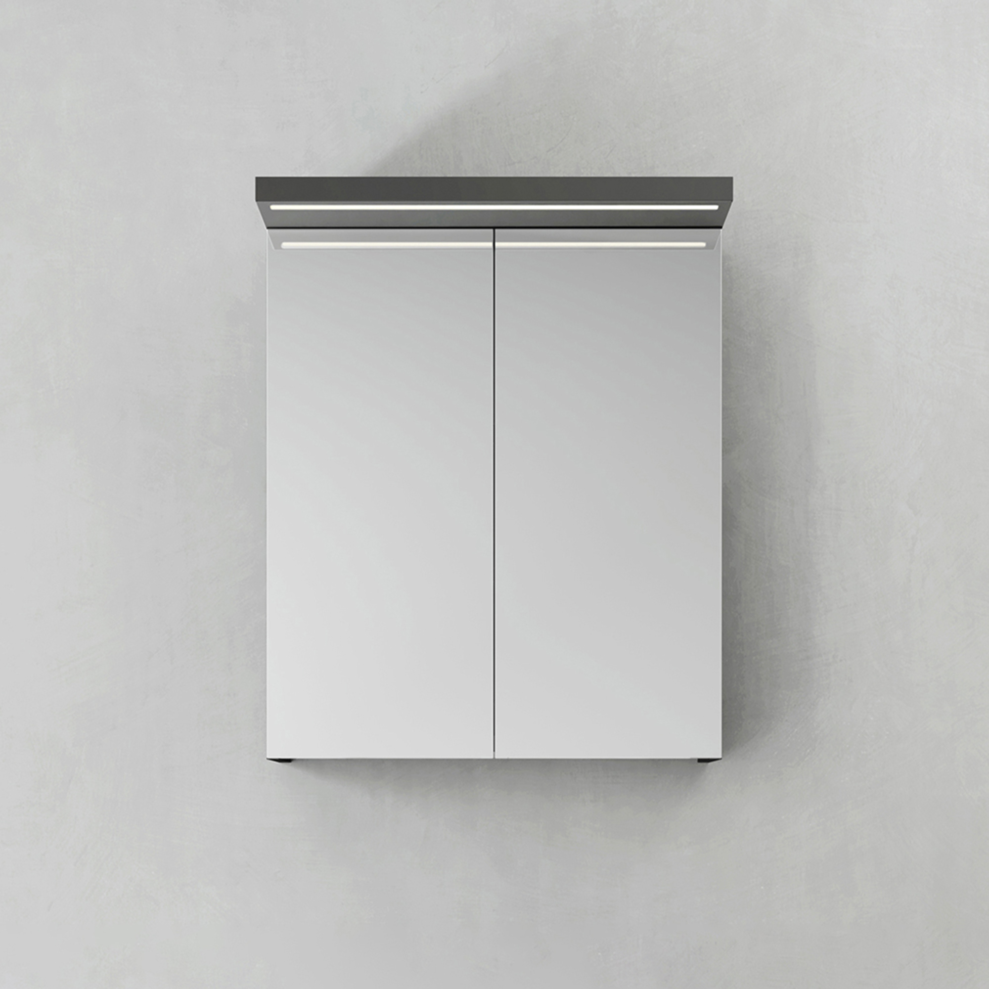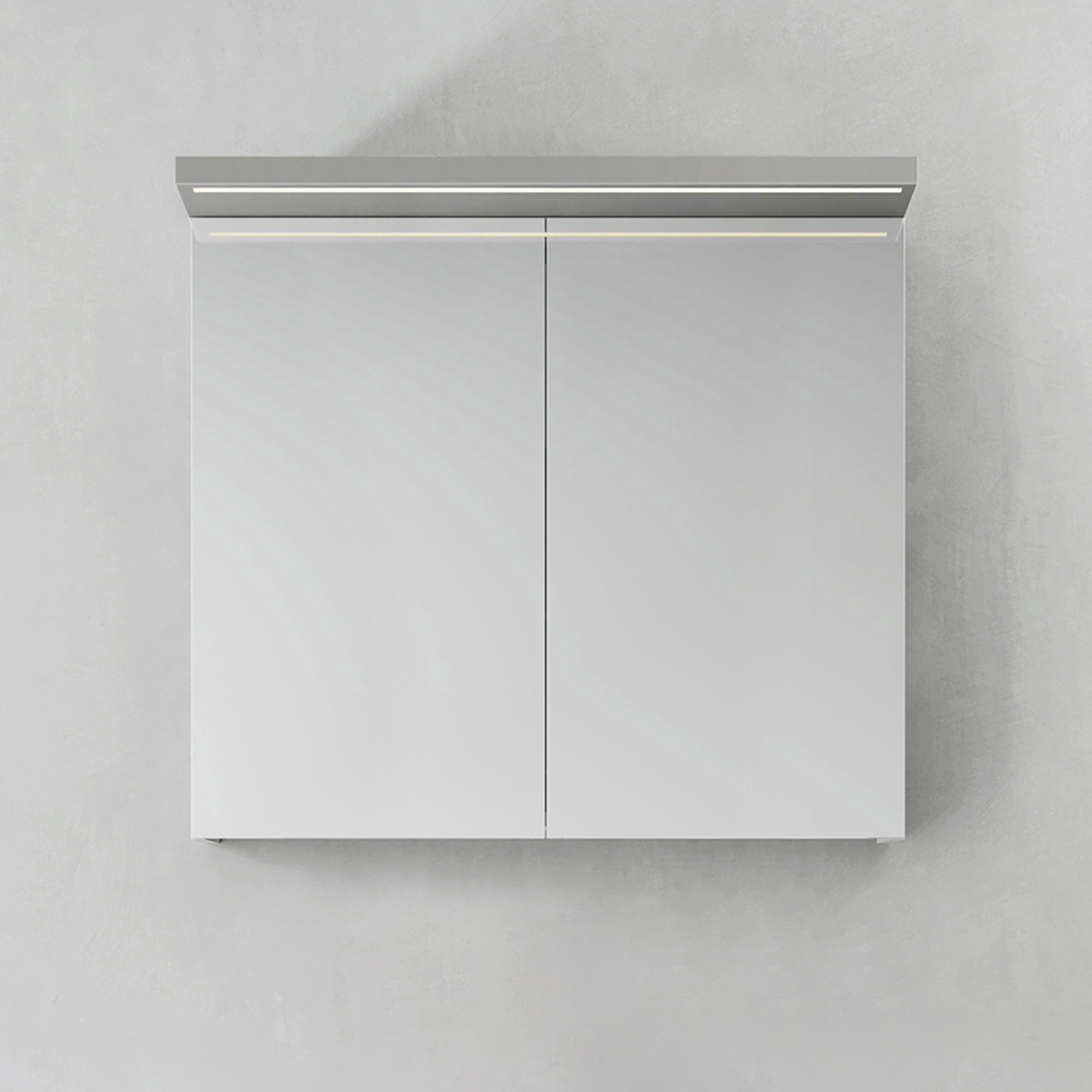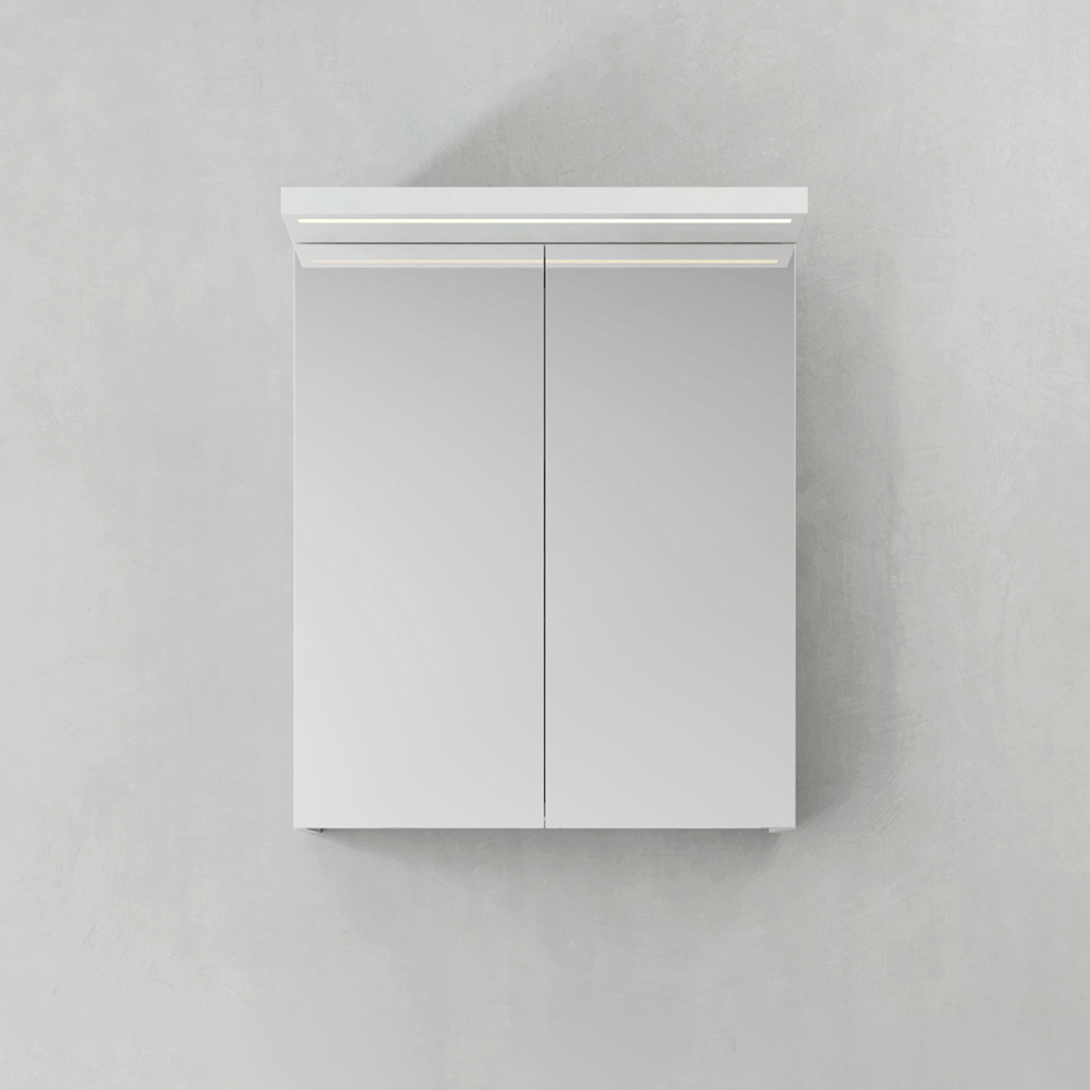 Spegelskåp med funktionell belysning med infälld LED-profil eller LED-spots i varmvitt ljus.