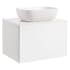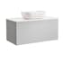 Tvättställsskåp Alterna Ella levereras med bänkskiva och ovanpåliggande, rekatngulärt tvättställ. Bänkskivan är gjord av kvartskomposit och tvättställ i porslin, 455x325x135 mm. Underskåpen har mjukstängande lådor. Handtag och blandare beställs separat.