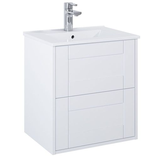 Tvättställsskåp Alterna Gabriella Vit Matt är ett stilrent tvättställsskåp med en underdel och ett porslinstvättställ. Underdelen är tillverkad i vattenavvisande MDF med lackerad ytbehandling. Den är dessutom 3D-laminerad vilket säkerställer extra tålighet mot fukt. Lådorna är mjukstängande. Tvättstället har blandarhål och bräddavlopp. Den eleganta designen gör att tvättställsskåpet passar in i de flesta badrum. Tvättställsskåpet levereras färdigmonterat.