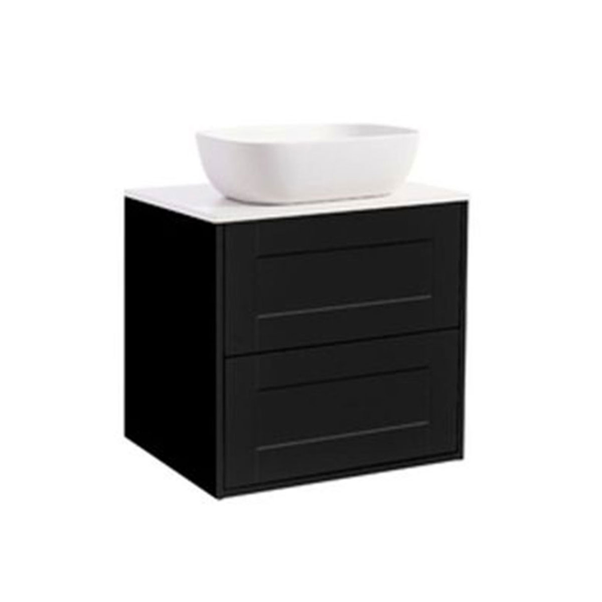 Tvättställsskåp Alterna Gabriella med bänkskiva och rektangulärt ovanpåliggande tvättställ. Bänkskivan är gjord av kvartskomposit och tvättställ i porslin, 455x325x135 mm. Underskåpen har mjukstängande lådor som ger en lyxig och tyst användning samtidigt som de ökar möbelns livslängd.