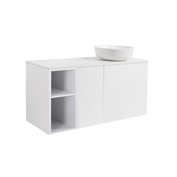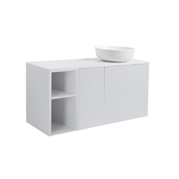 Underskåpet består av ett öppet skåp, ett tvättkorgsskåp samt två mjukstängande lådor. Det öppna skåpet är perfekt för förvaring av exempelvis handdukar eller annat som tål att visas upp, medan tvättkorgen och lådorna på ett diskret sätt gömmer undan sådant man inte vill ha framme. Bänkskivan är i slitstark kvartskomposit och det snygga, ovanpåliggande tvättstället i porslin.