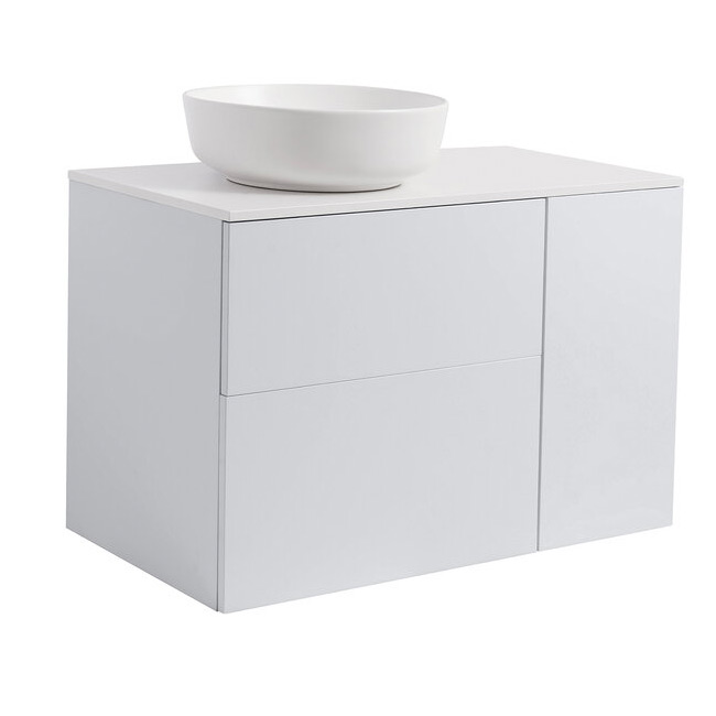 Tvättställsskåp Alterna Isella med bänkskiva i kvartskomposit och runt tvättställ. Skåpet levereras med en integrerad tvättkorg i 30-skåpet. Välj om du vill ha ett eller två stycken 30-skåp med tvättkorg. Bänkskivan är gjord av kvartskomposit och tvättstället i porslin, dia 415 mm. Underskåpen har mjukstängande lådor. Handtag och blandare beställs separat.