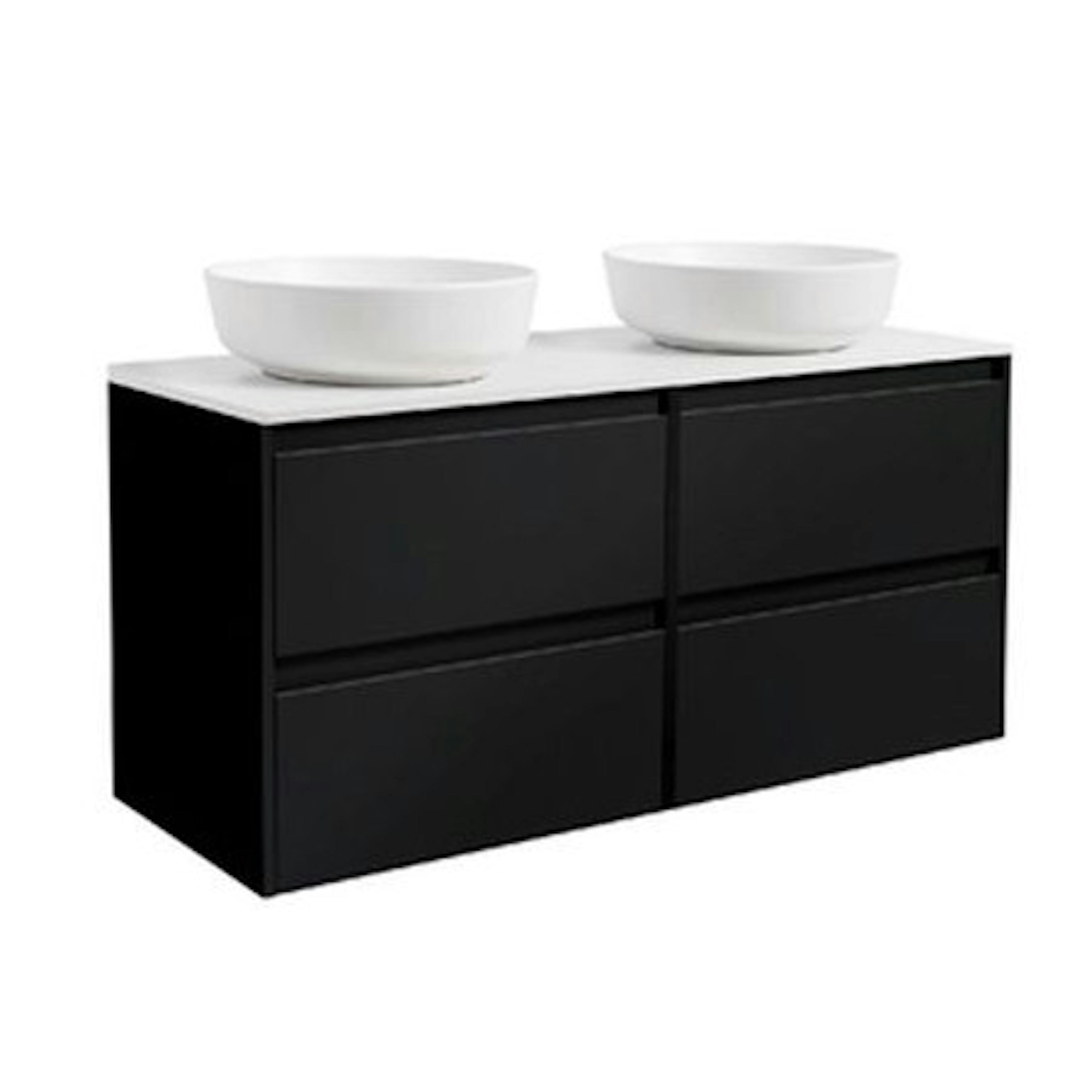Tvättställsskåp Alterna Luxor 120 Dubbelt med Bänkskiva Kvartskomposit och Runt TvättställFärg Tvättställsskåpet: Matt Svart, Färg Bänkskiva: Vit, Färg Tvättställ: Vit - B: 1210 mm, H: 737 mm, D: 470 mm