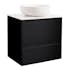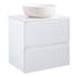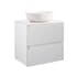 Tvättställsskåp Alterna Luxor med bänkskiva kvartskomposit och runt tvättställ. Bänkskivan är gjord av kvartskomposit och tvättställ i porslin, dia 415 mm. Underskåpen har mjukstängande lådor. Handtag och blandare beställs separat.