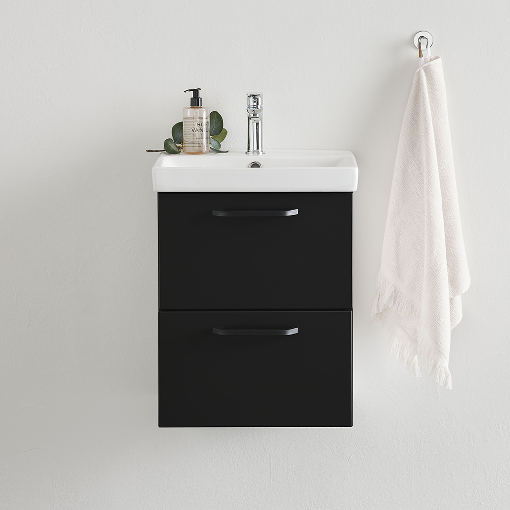 Tvättställsskåp Yster är en kompakt och praktisk badrumsmöbel med släta lådfronter i mattlackad finish. Tvättställskåpet har två lådor med Soft Close-funktion.