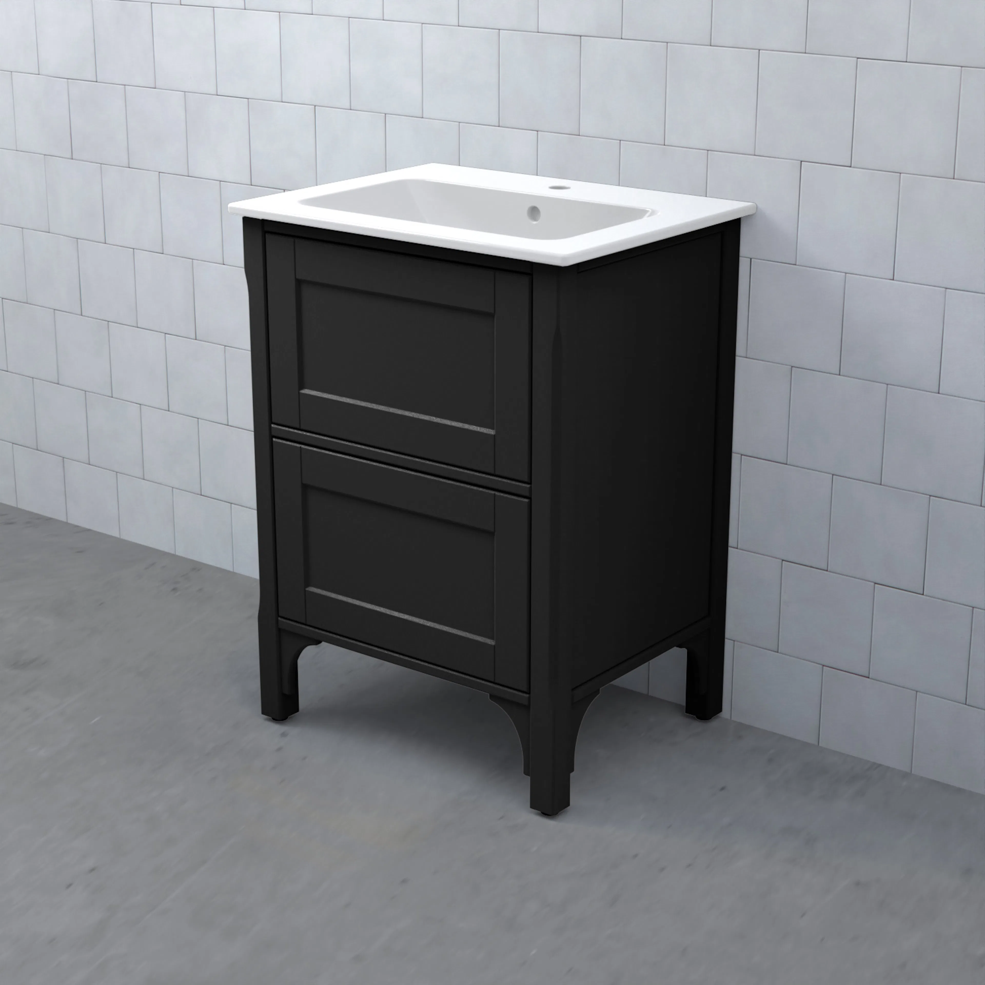 Tvättställsskåp Saga Enkel från Björbo Badrum är ett elegant tvättställsskåp som levereras utan tvättställ, handtag och blandare. Skåpet är gjort av massivt lövträd och har djupa och mycket stabila fullutdragslådor i svartbetsat trä med mjukstängning och självindrag. Det har ben som är justerbara på höjden och ger möbeln ett klassiskt uttryck som förhöjer stilen på möbeln, observera att skåpet alltid ska fästas i vägg. Detta tvättställsskåp levereras med vattenlås, lådindelare och lådmattor.