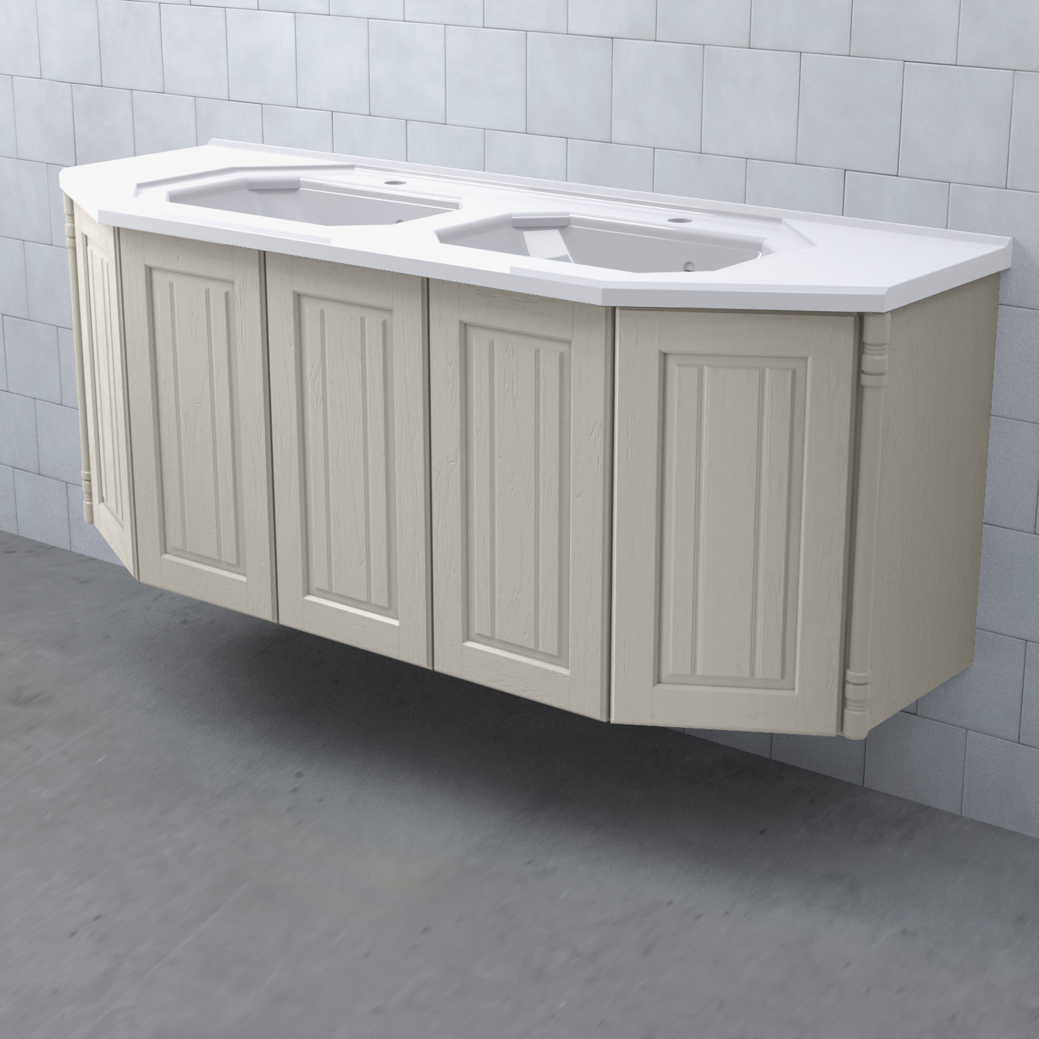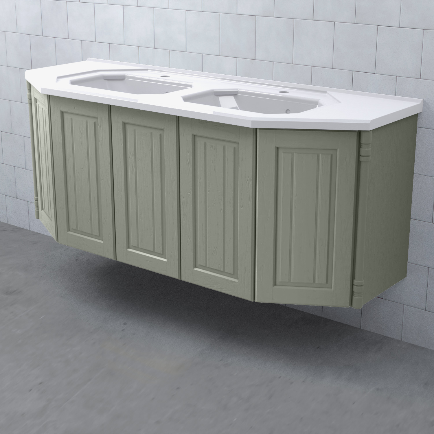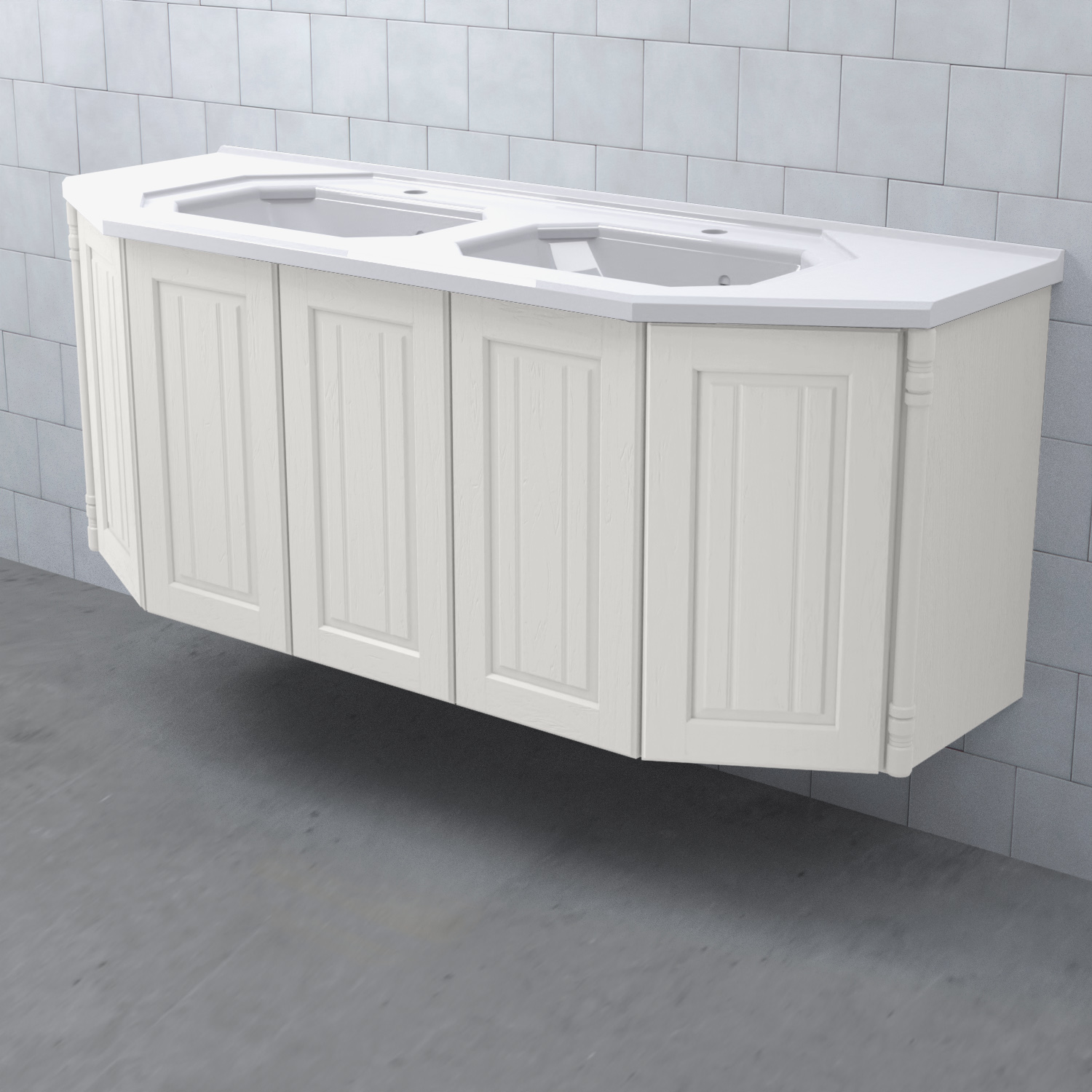 Tvättställsskåp Valhall 150 Luckor Dubbel från Björbo Badrum är ett elegant tvättställsskåp anpassat för dubbla tvättställ med sekelskiftesdetaljer som levereras utan tvättställ, handtag och blandare. Detta badrumsskåp har luckor gjorda av målad, präglad MDF och leverer med vattenlås, lådindelare och lådmattor. Stommen är gjord av målad MDF.