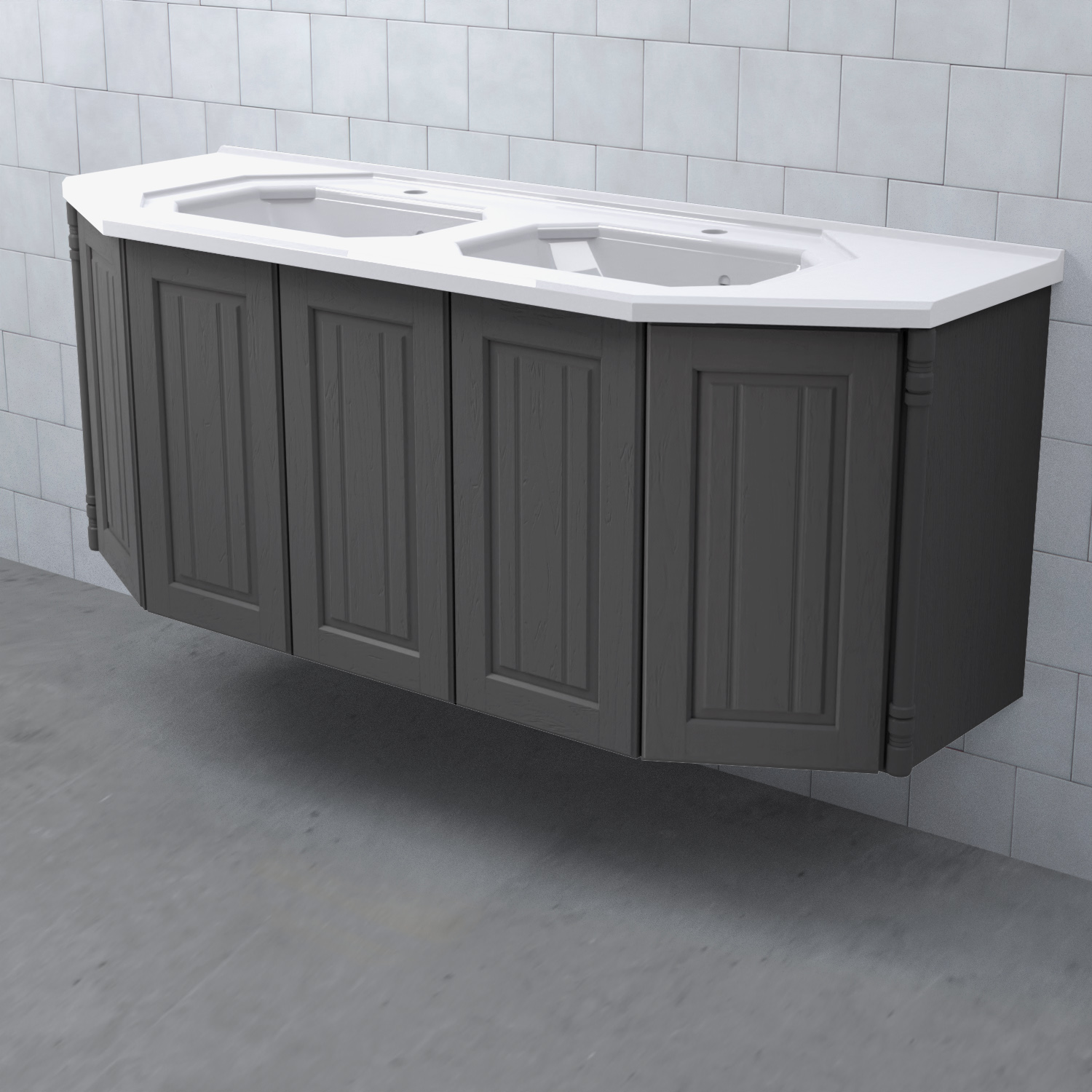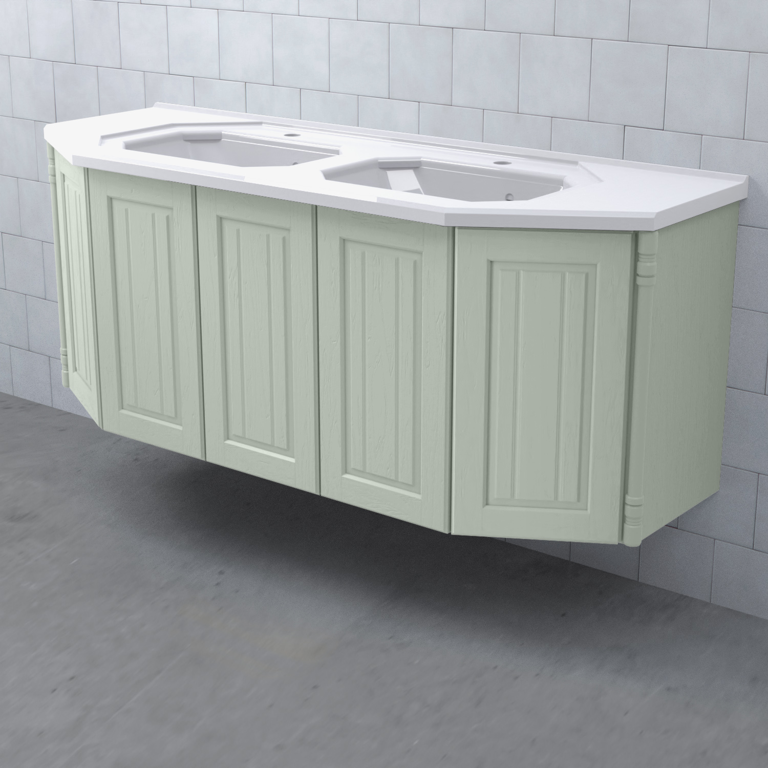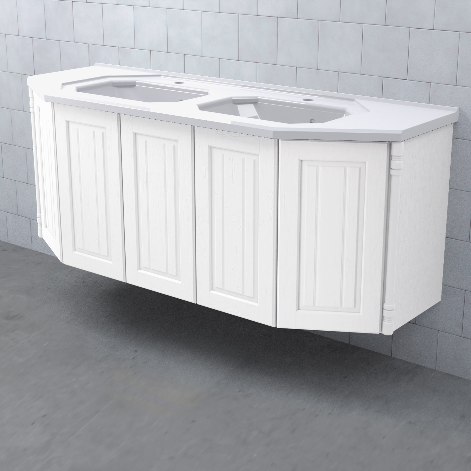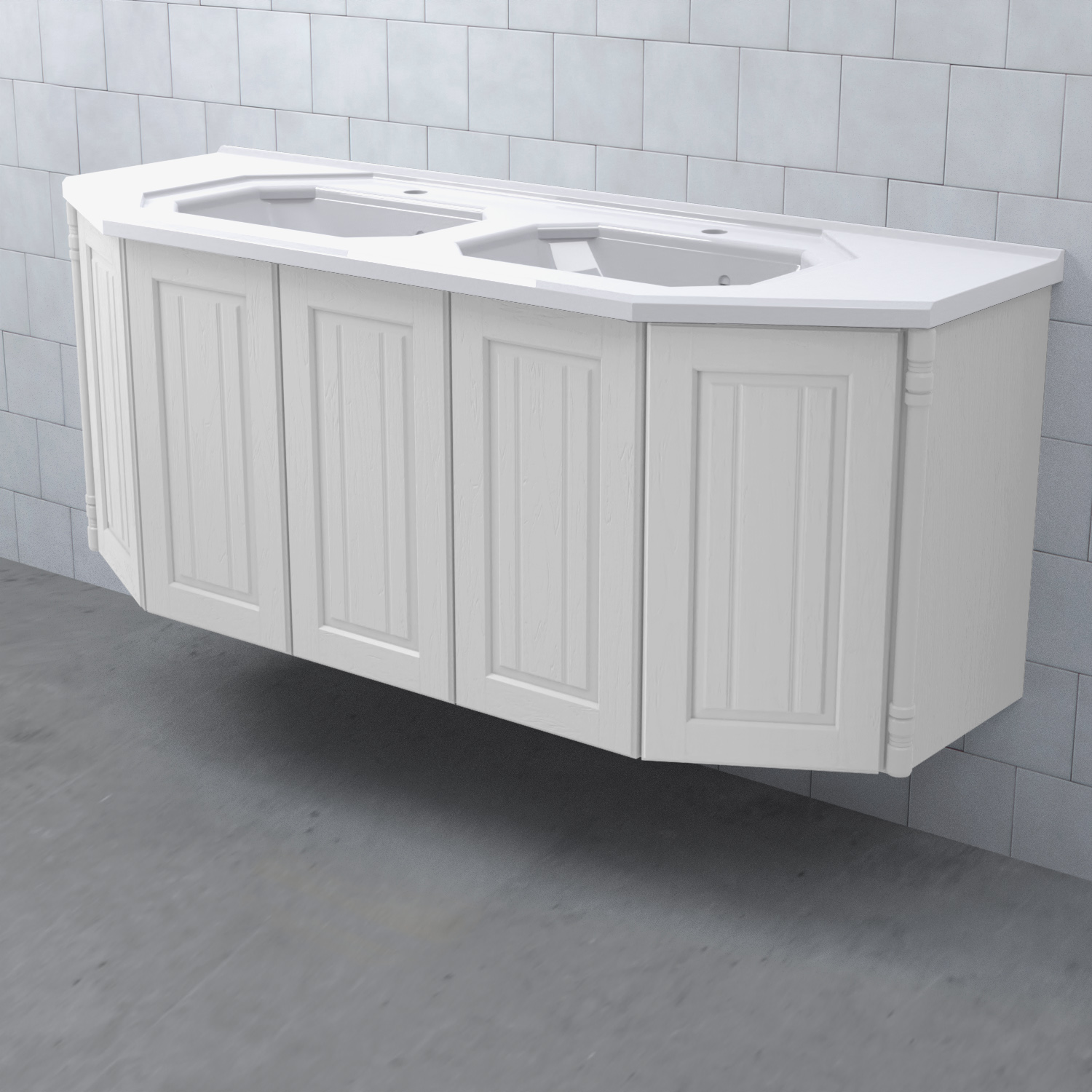 Tvättställsskåp Valhall 150 Luckor Dubbel från Björbo Badrum är ett elegant tvättställsskåp anpassat för dubbla tvättställ med sekelskiftesdetaljer som levereras utan tvättställ, handtag och blandare. Detta badrumsskåp har luckor gjorda av målad, präglad MDF och leverer med vattenlås, lådindelare och lådmattor. Stommen är gjord av målad MDF.