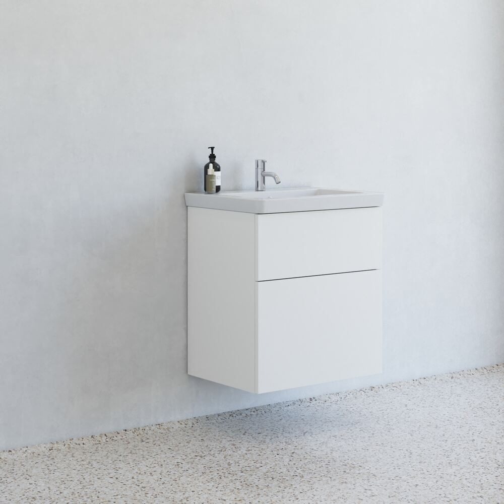 Tvättställsskåpet rymmer två praktiskt utformade lådor med fokus på effektiv förvaring. Den övre lådan är anpassad för mindre badrumsartiklar, medan den nedre är extra hög och ger plats åt större föremål som handdukar, flaskor och hårfön. Samtliga lådor är fullt utdragbara så att du enkelt når även längst in, och har mjukstängande funktion som säkerställer en tyst och kontrollerad stängning varje gång.