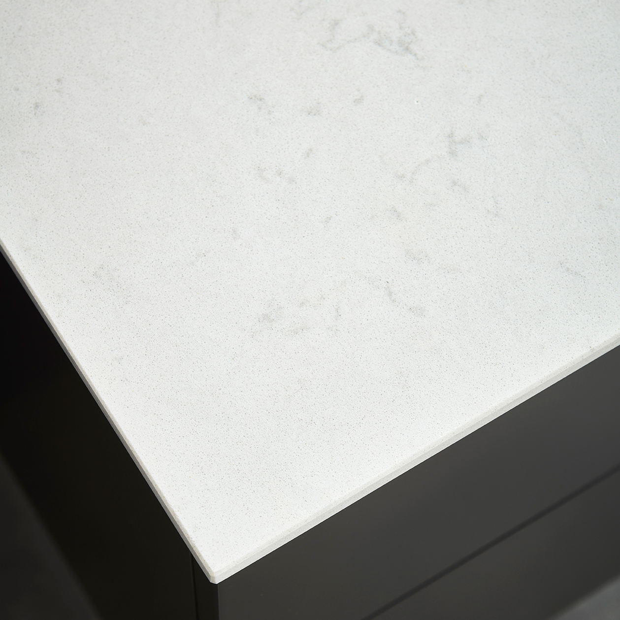 Tvättställsskåpspaketet har en bänkskiva tillverkad av Silestone. Silstone består av tålig kvarts med vackra färger och strukturer. Bänkskivan har förborrade hål för enkelt tvättställ och tvättställsblandare på ena sidan.