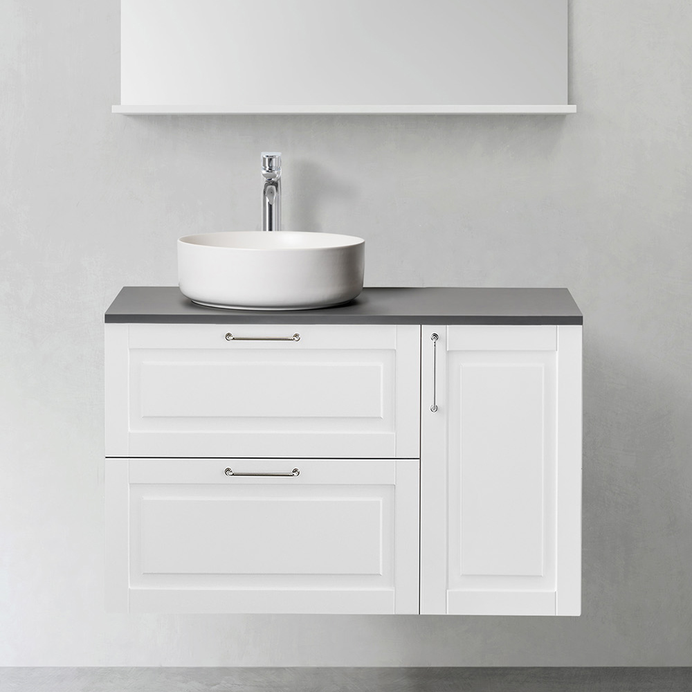 Välj handtag eller knopp som passar din stil och komplettera med fristående handfat på en bänkskiva eller nedsänkt tvättställ i porslin. Köp till blandare, bottenventil, vattenlås, lådbelysning och eluttag.