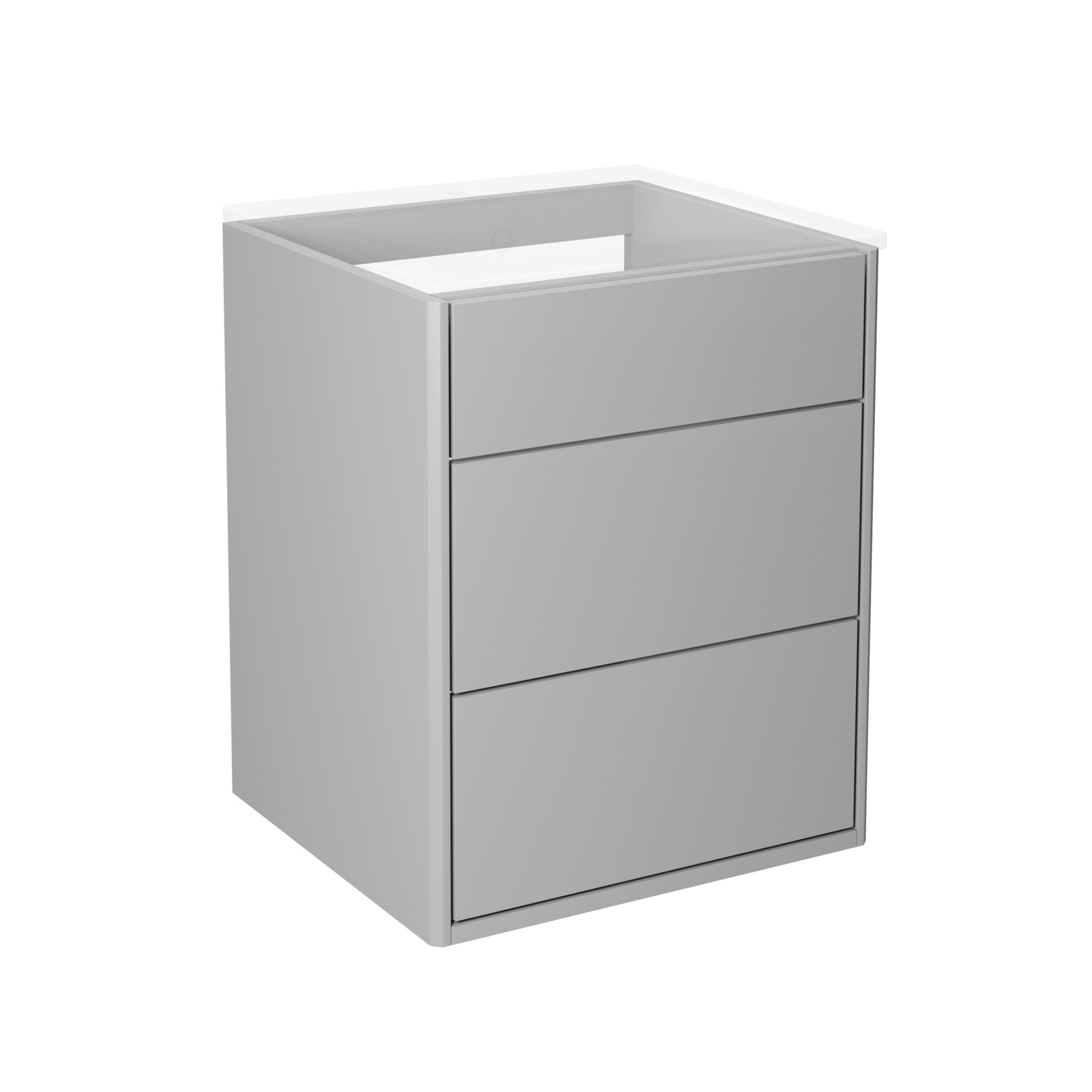Tvättställsskåpet har plats för rördragning bakom lådorna. Skåpet är tillverkat av fukttrög MDF som är klassad för badrum och det har samma material och färg på stomme, lådfronter och lådor.
