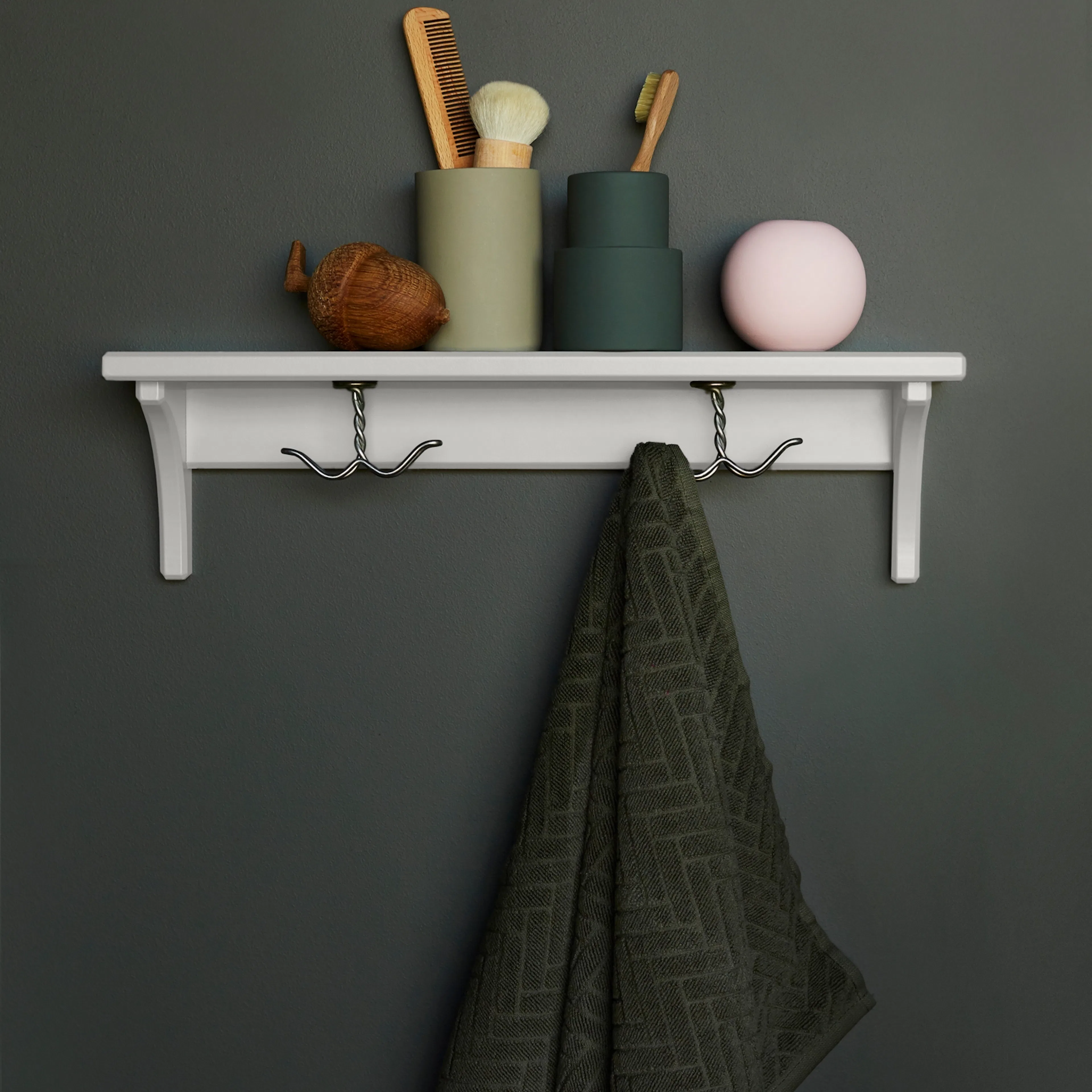 Handdukshängare Saga från Björbo Badrum är en hängare med en liten hylla och två praktiska krokar under att hänga exempelvis handdukar på. Hyllan är gjord av målad MDF med vackra detaljer.