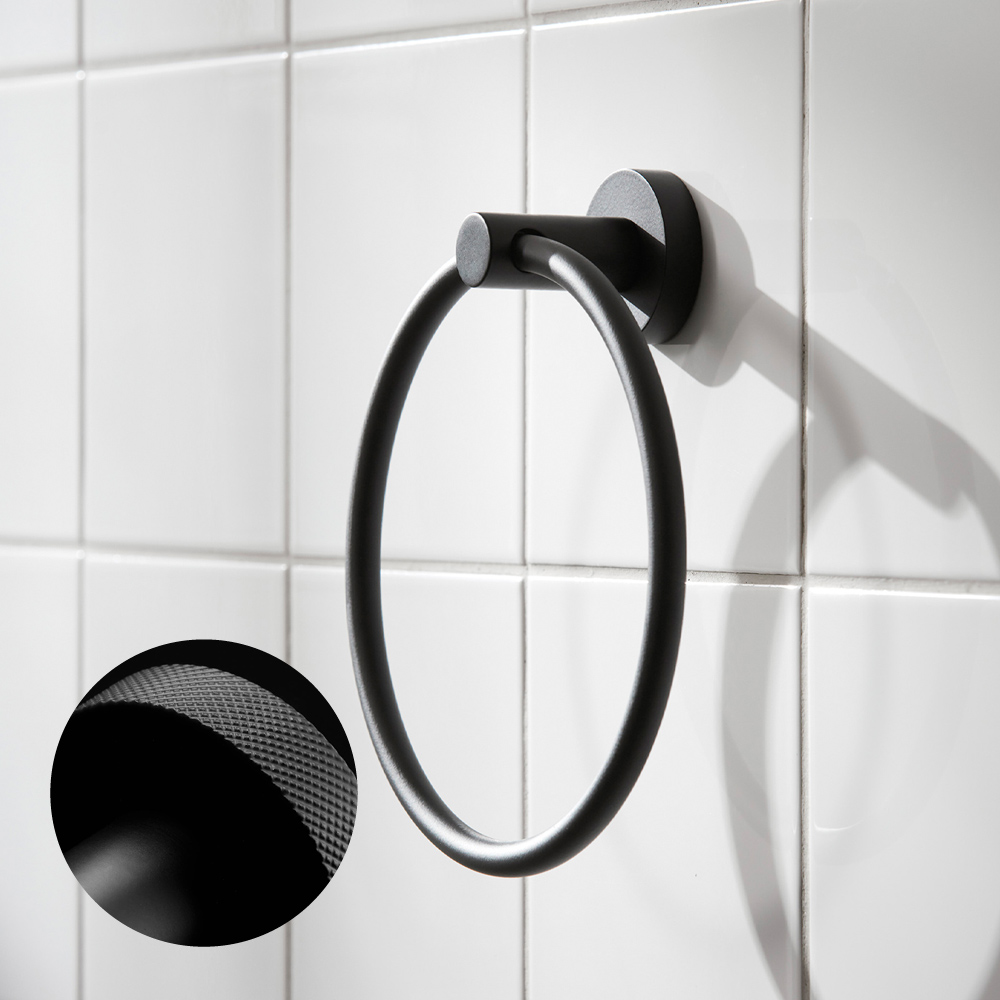 Handduksring från Miller Badrum. Väggplattans diameter är 45 mm.