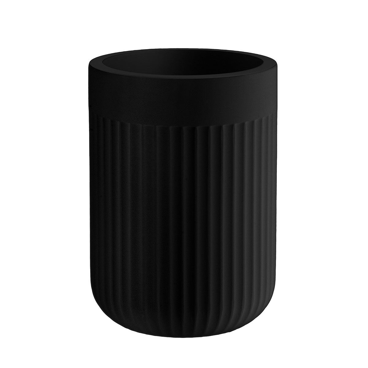 Modernt designad tandborstmugg för dagligt bruk. Denna fristående mugg är tillverkad av högkvalitativ polyresin, en plast som torkar till ett hållbart och slitstarkt material. Ytan är räfflad, tandborstmuggen är en praktisk och stilfull detalj i badrummet. Produkten ska inte rengöras i diskmaskin.