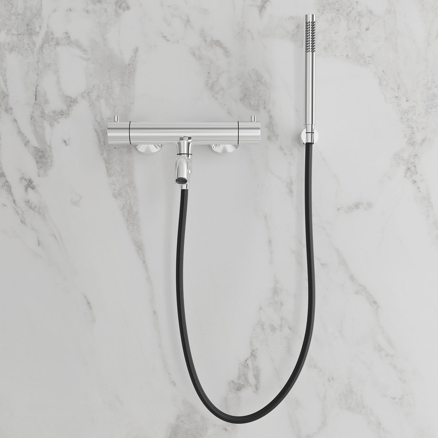 Badkarsblandare Scandtap Steel Pleasure 4 med Handdusch är en badkarsblandare tillverkad av rostfritt stål med 1,5 m duschslang, handdusch och handduschfäste. Den har en termostatblandare med integrerad omkastare, infällbar badkarspip och slang med antitwist-funktion. Blandaren har två funktioner: handdusch och badkarspip.