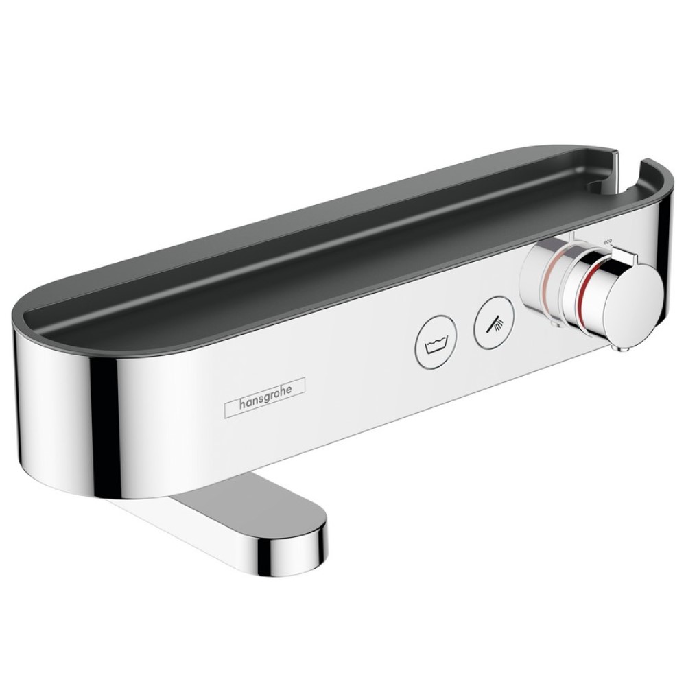 Dusch- och Badkarsblandare Hansgrohe ShowerTablet Select 400 kombinerar en utanpåliggande termostatblandare i dusch och bad med en praktisk, högkvalitativ förvaringsyta. Avancerad teknik säkerställer intuitiv drift, medan duschtillbehör är säkert placerade inom räckhåll.
