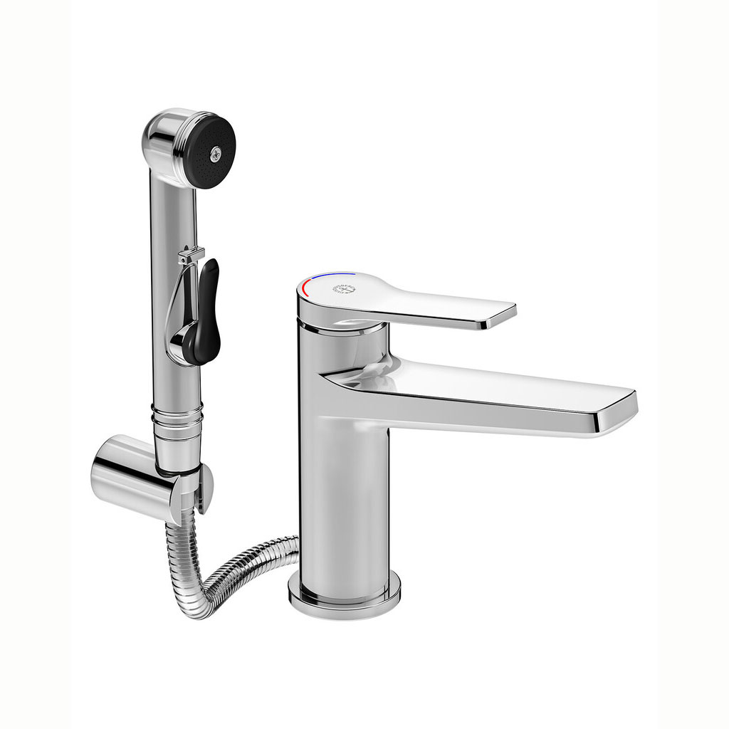 Tvättställsblandare Epic med sidodusch som underlättar rengöring och intimhygien.