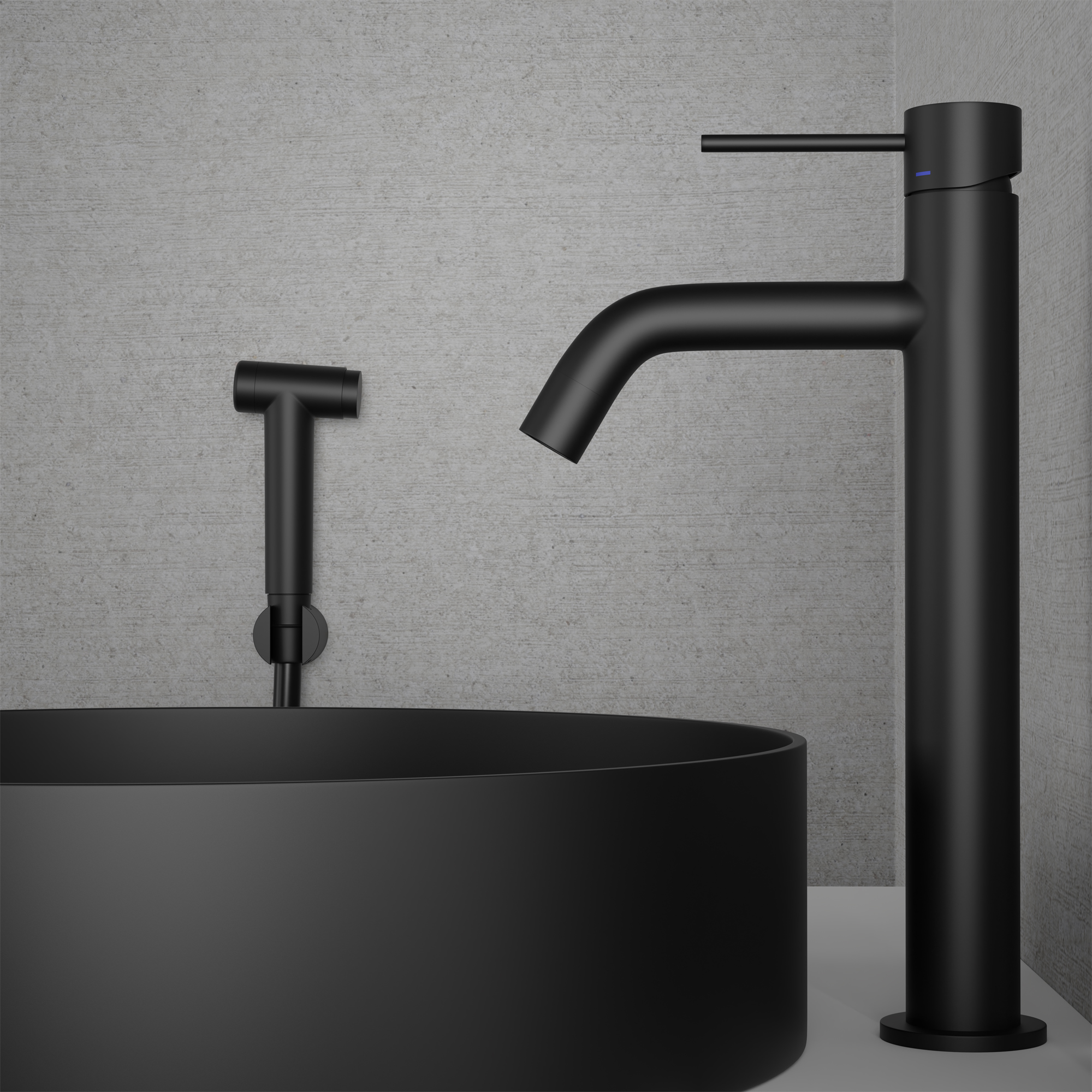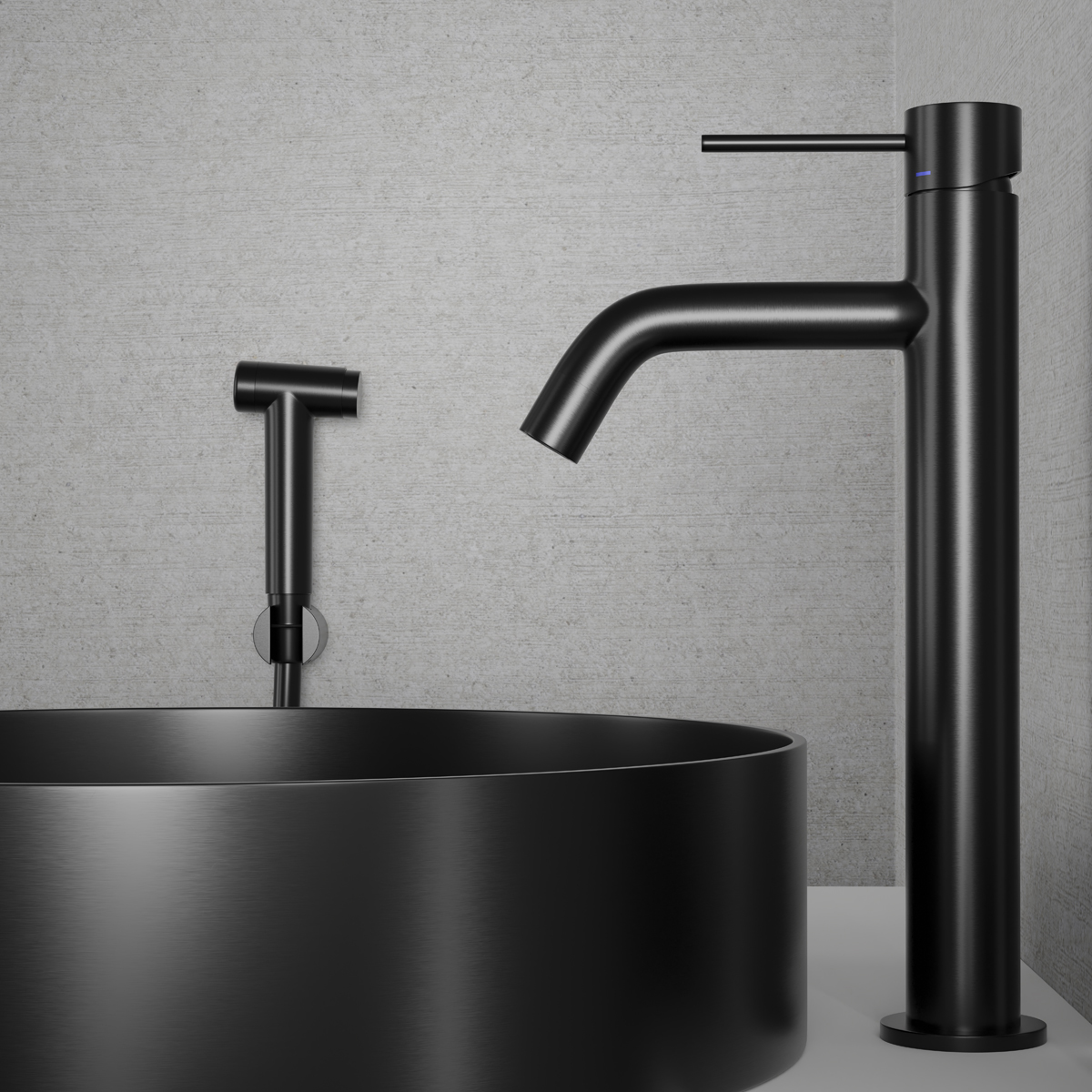 Tvättställsblandare Scandtap Steel Voyage High med Sidodusch - samma stilrena design som Voyage, utrustad med ett bidetmunstycke i rostfritt stål .
