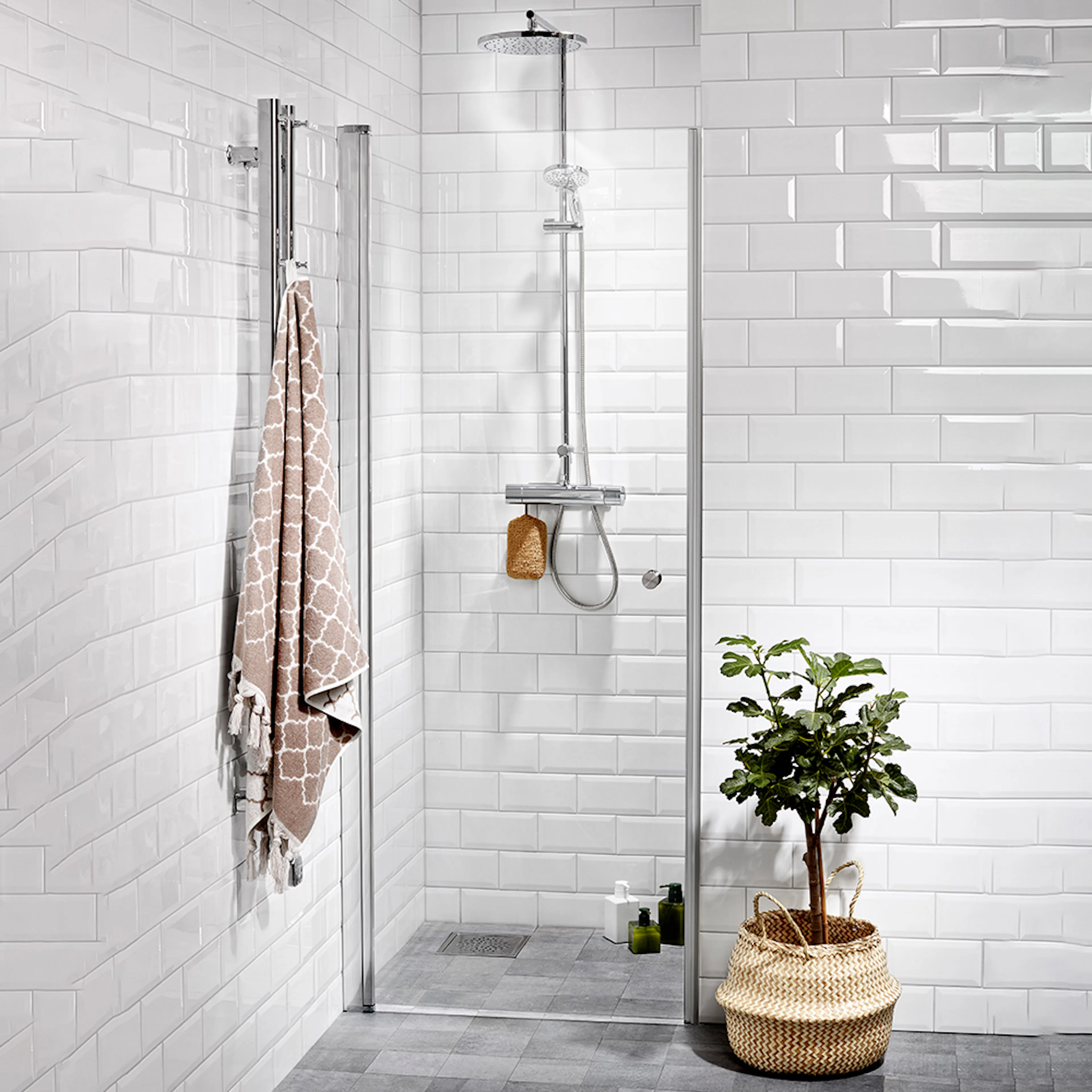 Duschväggen har justerbar väggprofil +/- 10 mm och levereras komplett med 1 duschdörr, dörrknopp och släplist. Nischprofil och magnetlist beställs separat.