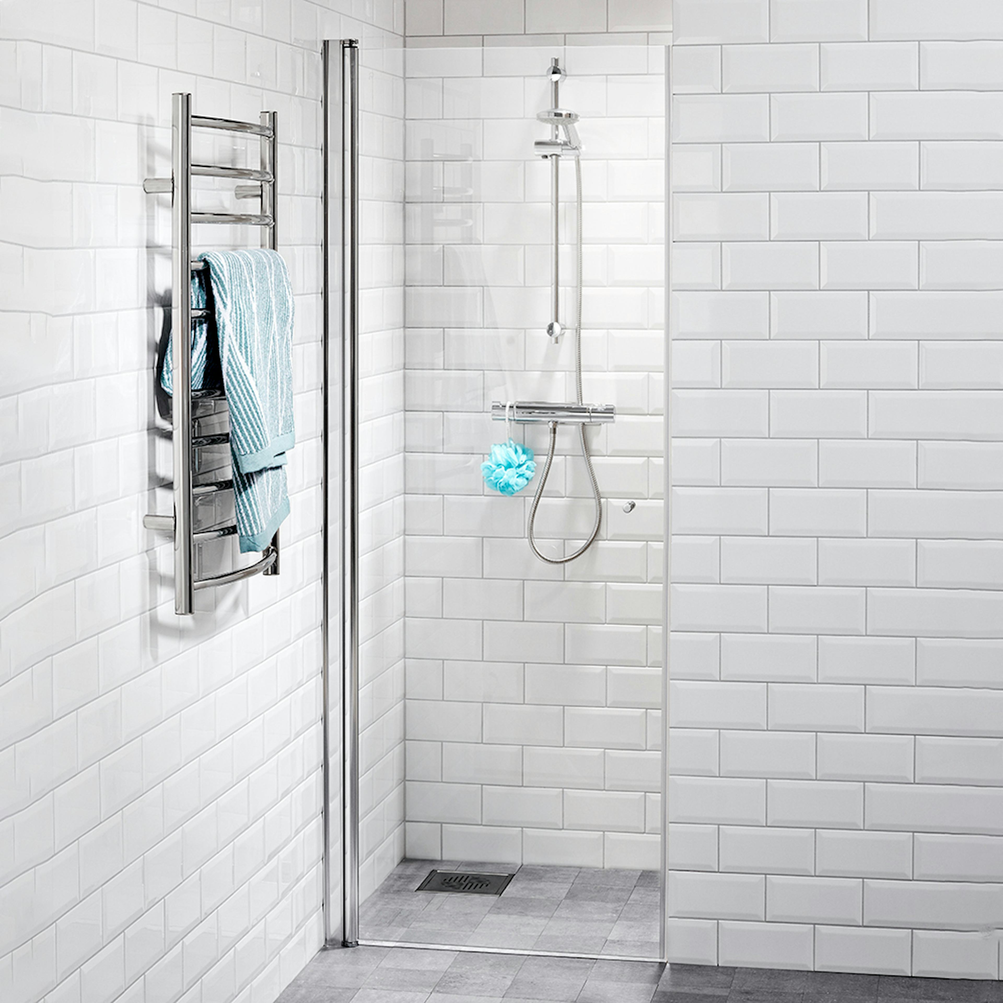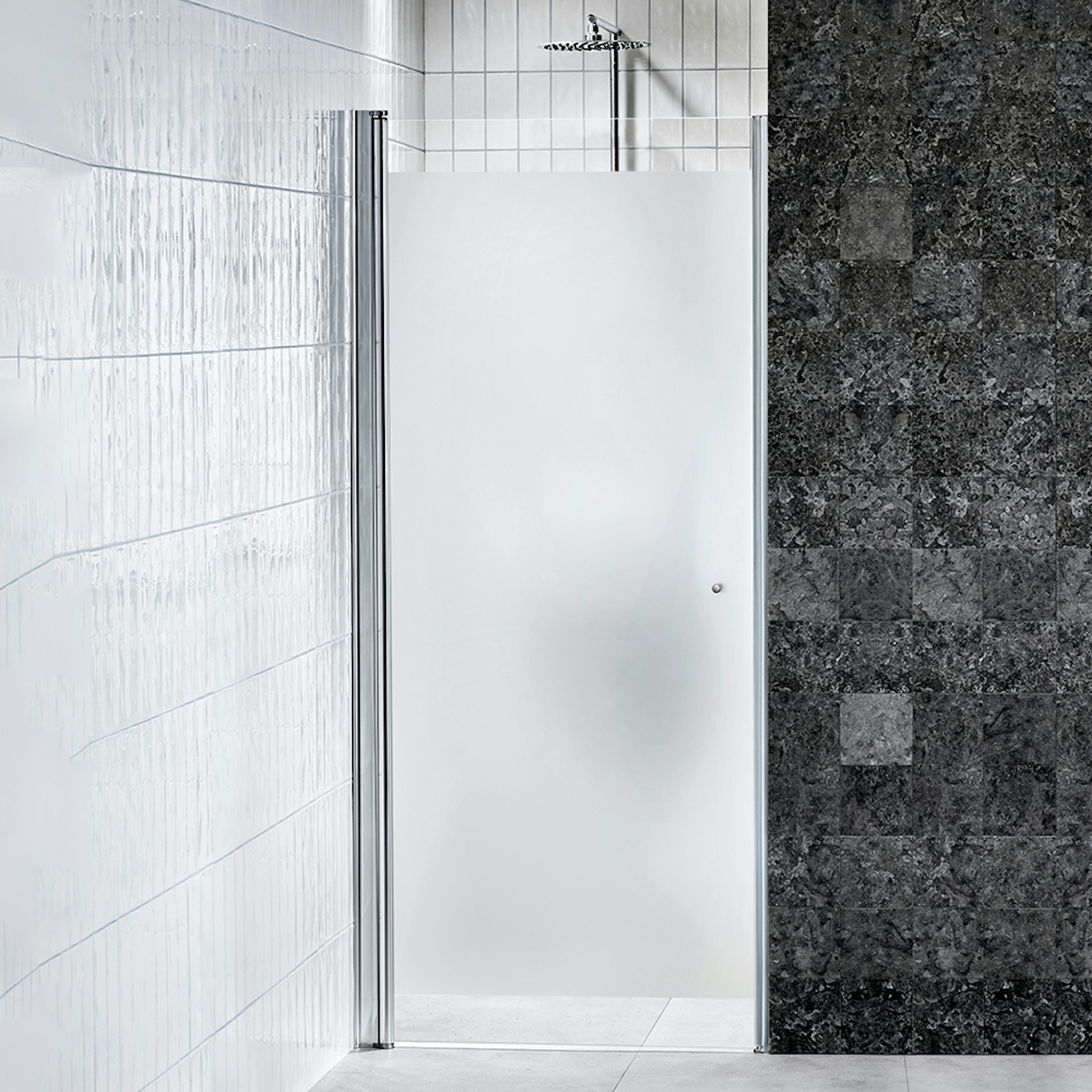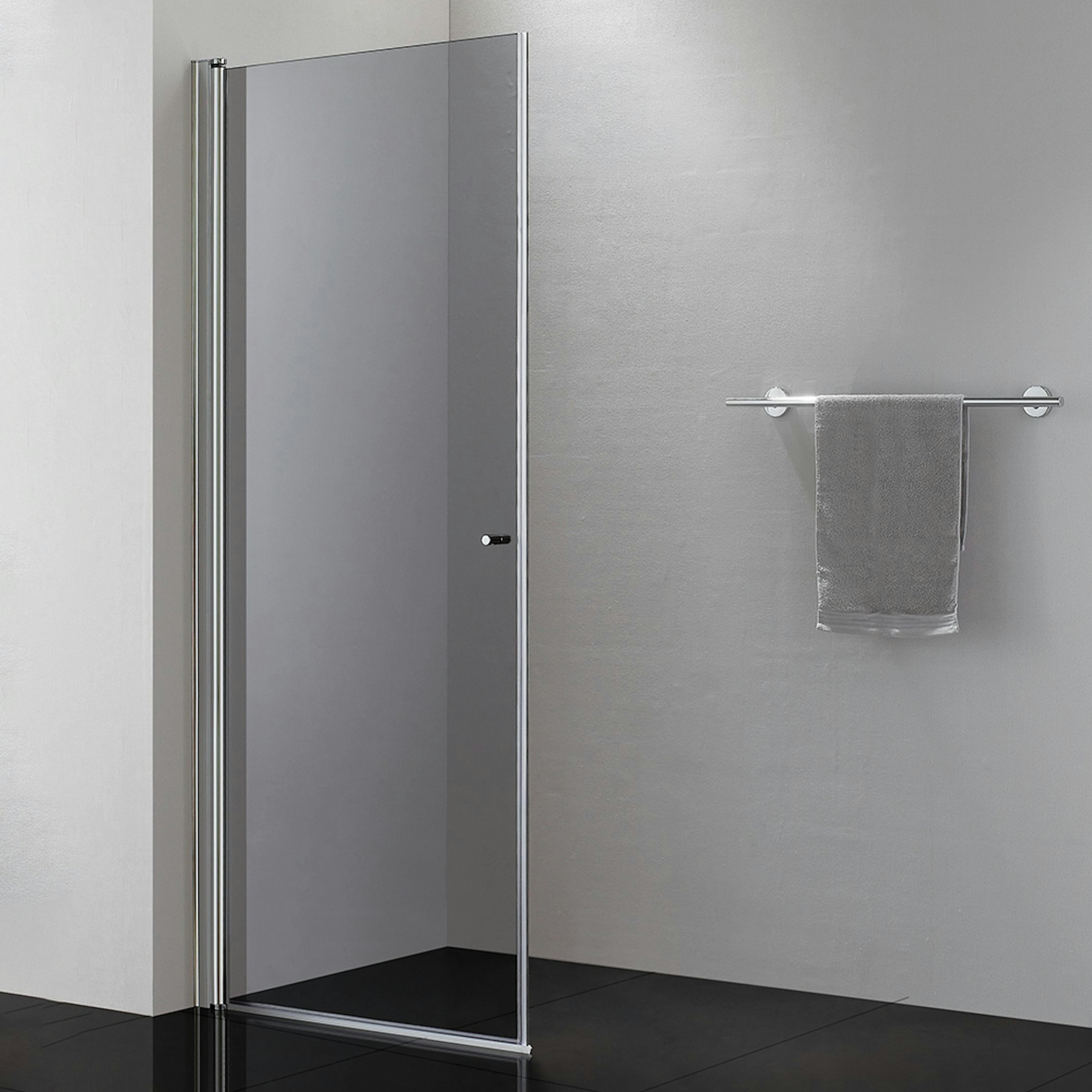 Duschväggen har justerbar väggprofil och levereras komplett med släplist och handtag.
