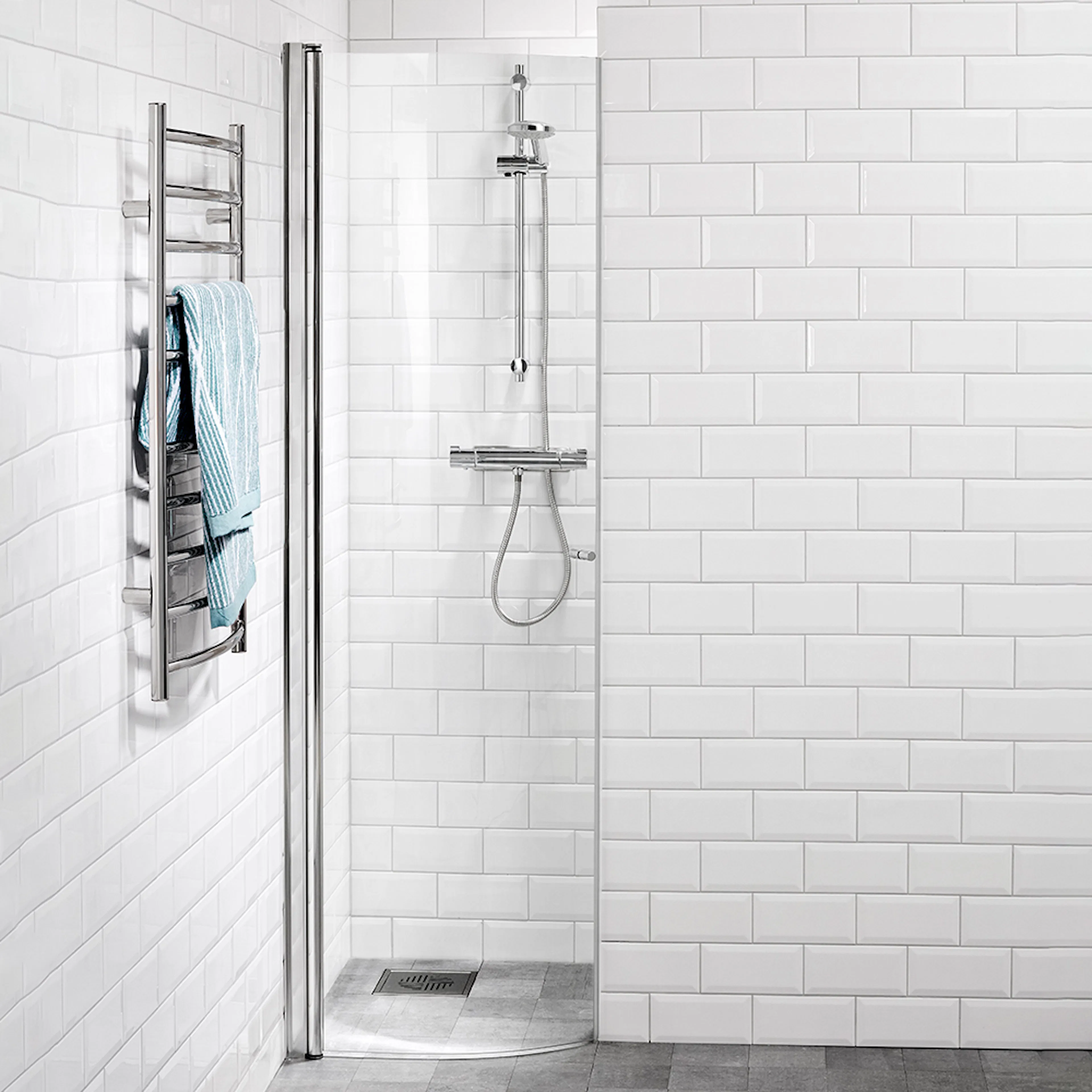 Duschväggen har justerbar väggprofil och levereras komplett med släplist och handtag.