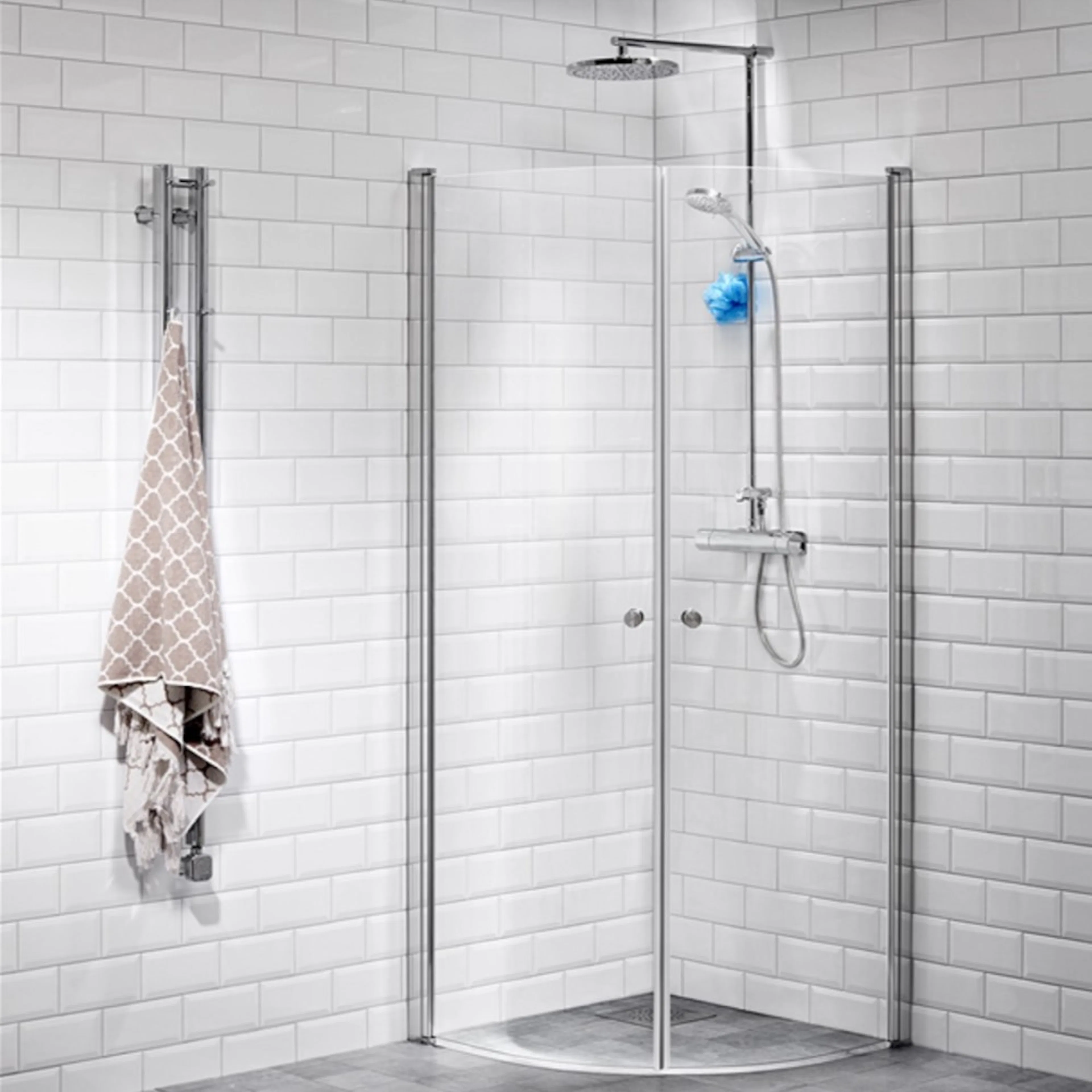 Duschhörn Alterna Lusso Svängd är ett stilrent duschhörn med mjukt rundade dörrar med snabbfästen för enklare montering och med limbar väggprofil. Duschhörnan med vändbara, svängda dörrar är tillverkad i 6 mm härdat säkerhetsglas med blankpolerade aluminiumprofiler i rostfritt stål. Den eleganta och moderna designen gör att duschen passar de flesta badrum. Duschdörrarna kan även öppnas inåt för platsbesparing, då höjs de 4 mm från golvet. Duschhörnan har justerbar väggprofil och levereras komplett med två duschdörrar, släplist, magnetlist och knopp/handtag.