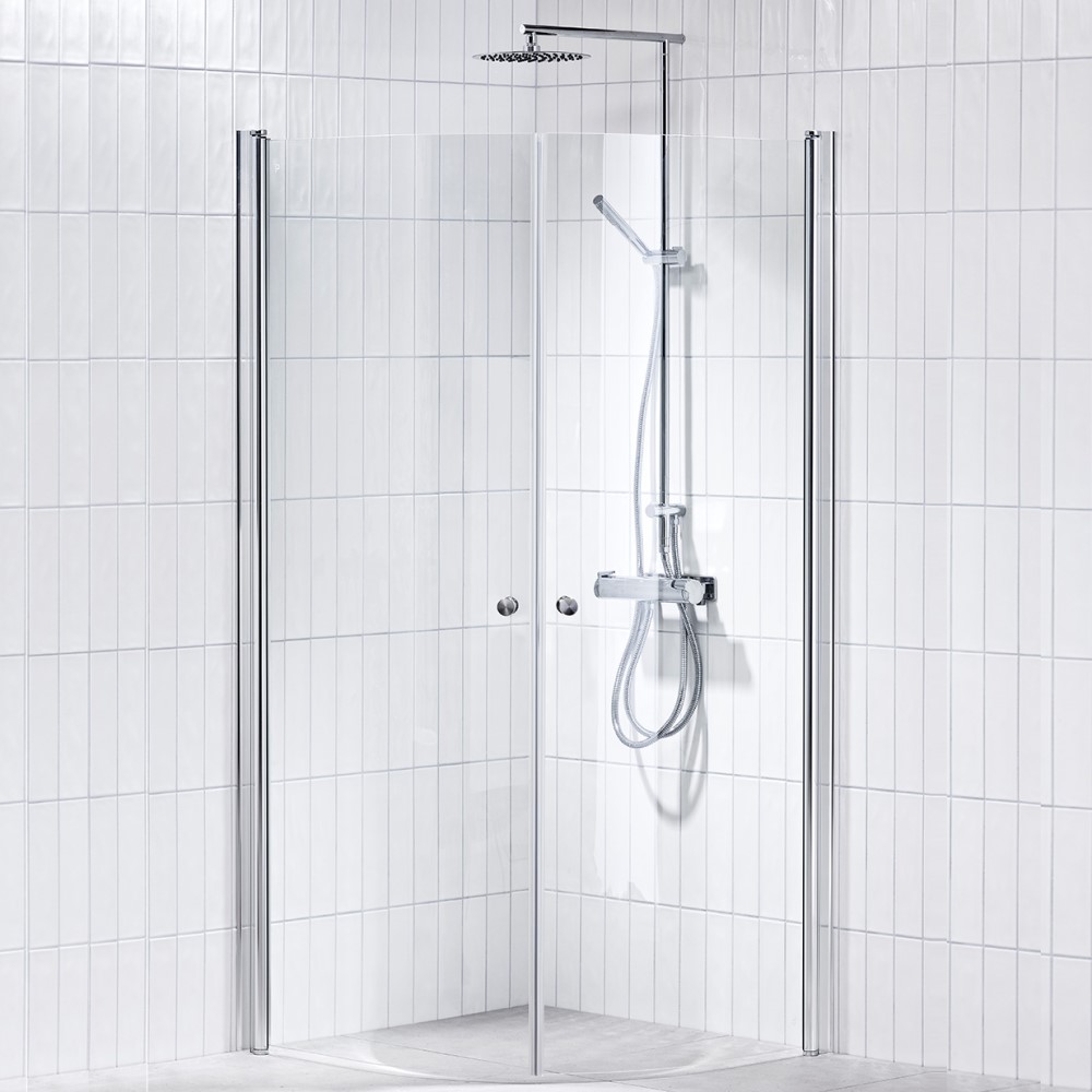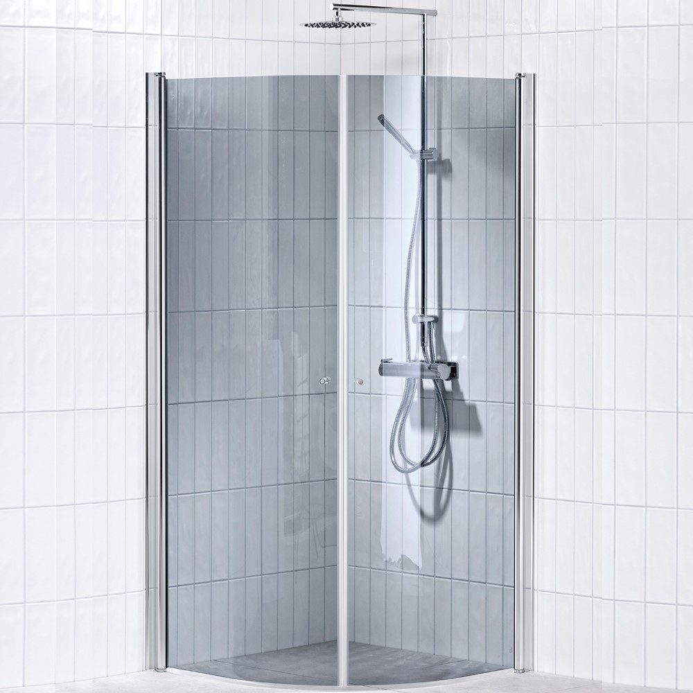 Duschhörn Alterna Picto Svängd är en elegant duschhörna med svängda och vändbara dörrar tillverkade i 6 mm härdat säkerhetsglas. Den stilrena och moderna designen gör att den passar in i de flesta badrum. Dörrarna har en svängradie på 180°, vilket ger bra med utrymme vid användning. När duschen står tom kan dörrarna dessutom enkelt fällas in mot väggen för att spara utrymme.