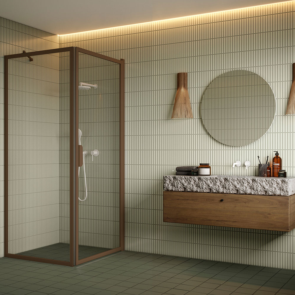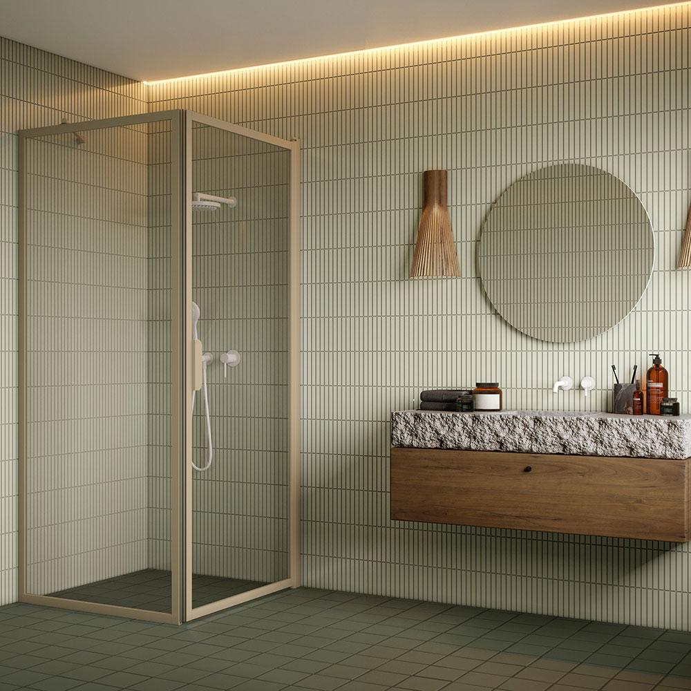 Den fasta duschväggen är fastsatt på väggfästena med självborrande skruvar. Dörrpanelen är monterad på andra sidan av utrymmet med väggfästen. Stödstången sätts upp från den övre kanten av den fasta panelen och skruvas in i byggnadens vägg. Magnettätningar installeras på varje dörrpanel för att hålla dörren tätt stängd. Sockeltätning kan fästas på panelerna och en tröskelprofil kan installeras under dörrpanelerna för att förbättra vattentätningen.