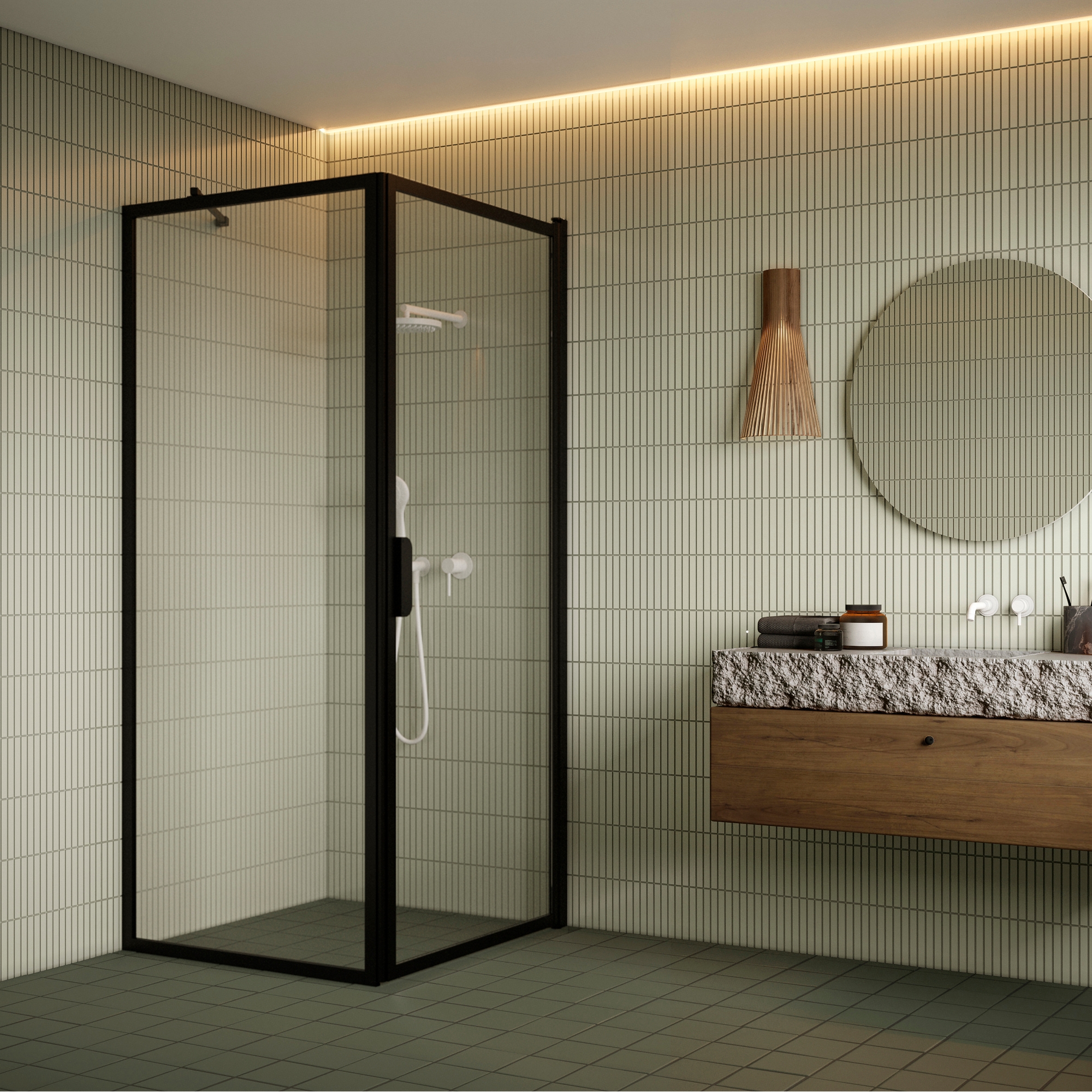 Duschhörn HietakariBläk 755 New York Fast Vägg och Vändbar Dörr719 Fast Vägg (L1) x 817 Vändbar Dörr (L2) mm, Klarglas, Svarta Profiler