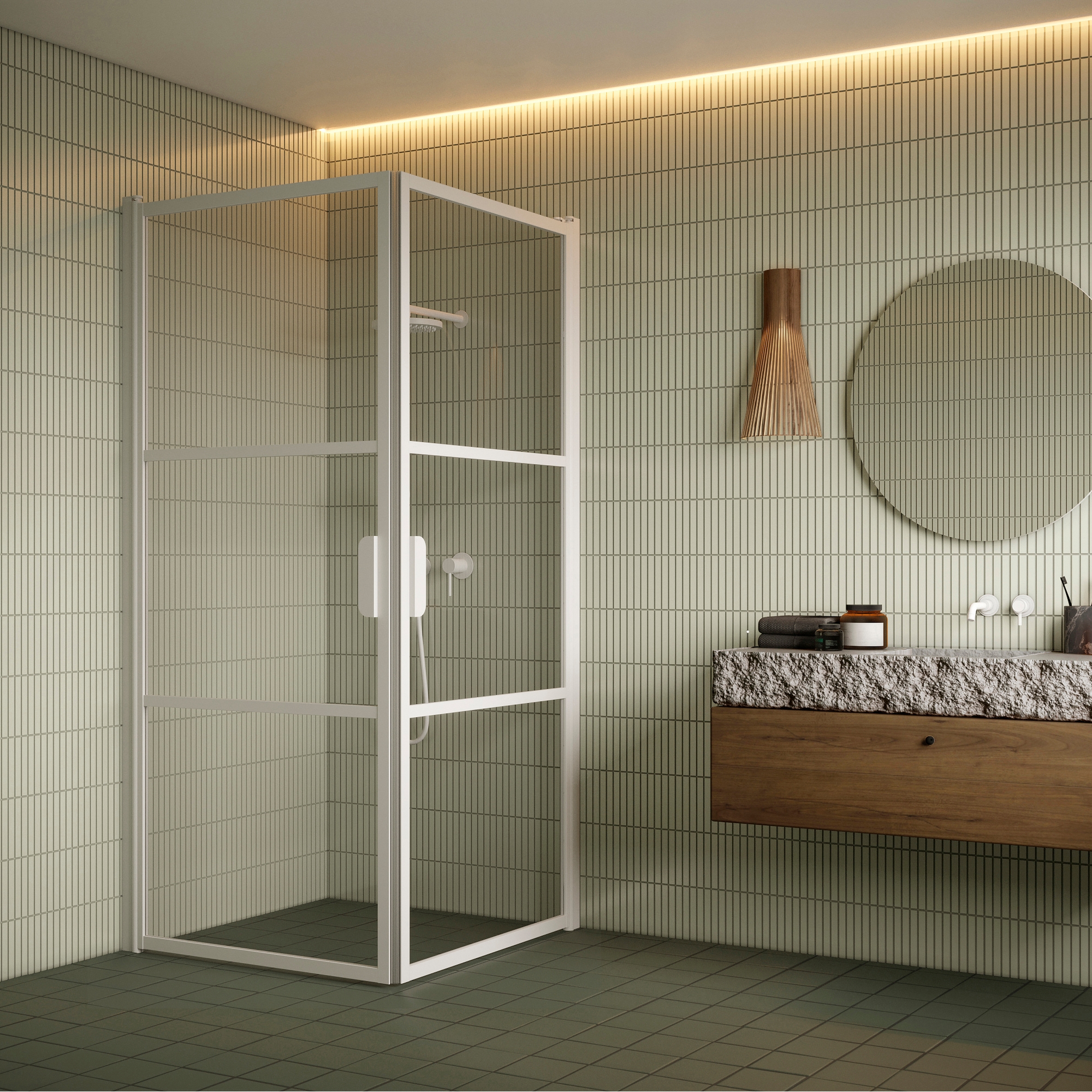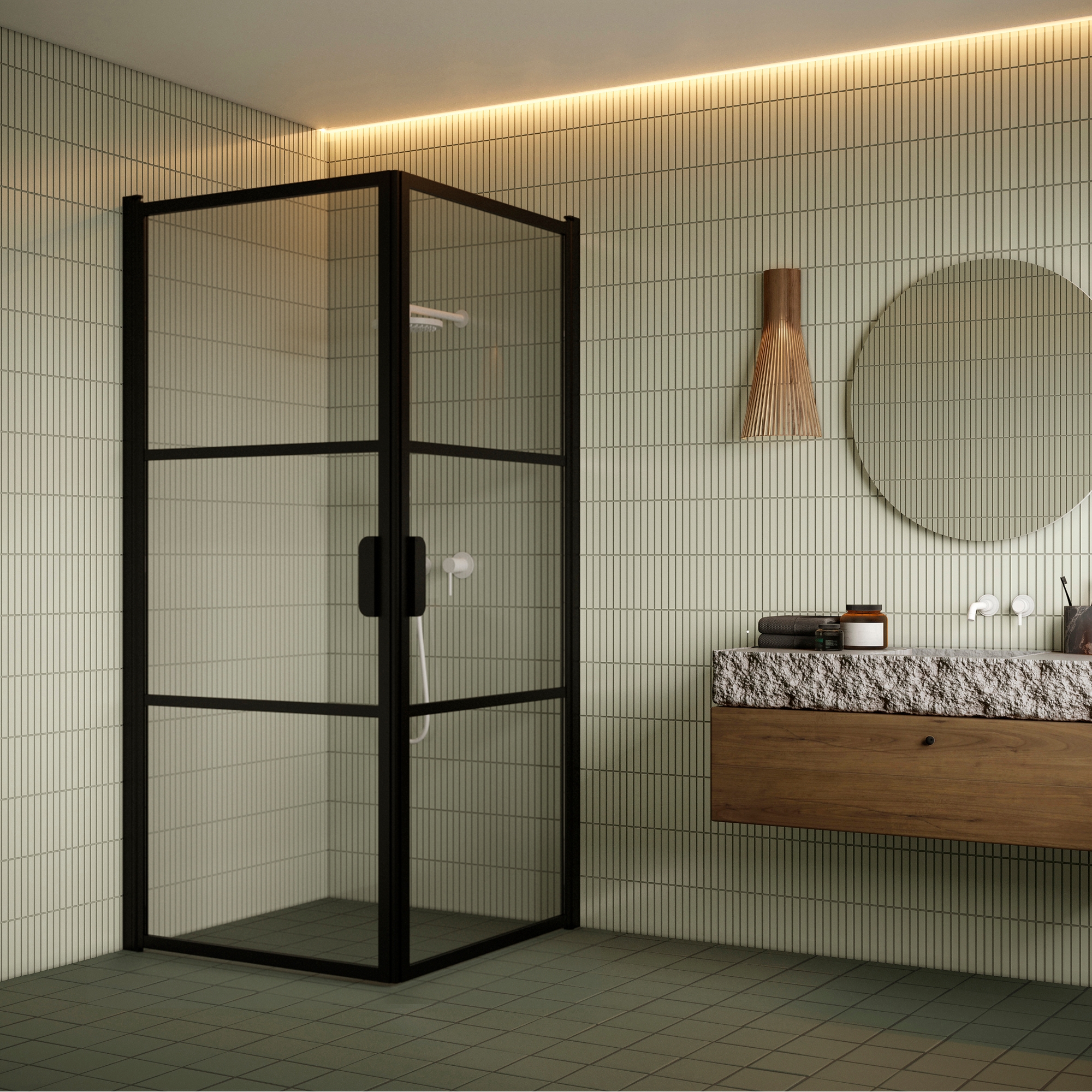 Dörrpanelerna är monterade på byggnadens vägg med väggfästen på vardera sidan av duschhörnan. Släptätning och tröskelprofiler kan installeras under dörrpanelerna för att förbättra vattentätningen. Magnettätning installeras på varje dörröppning för att hålla dörren tätt stängd.