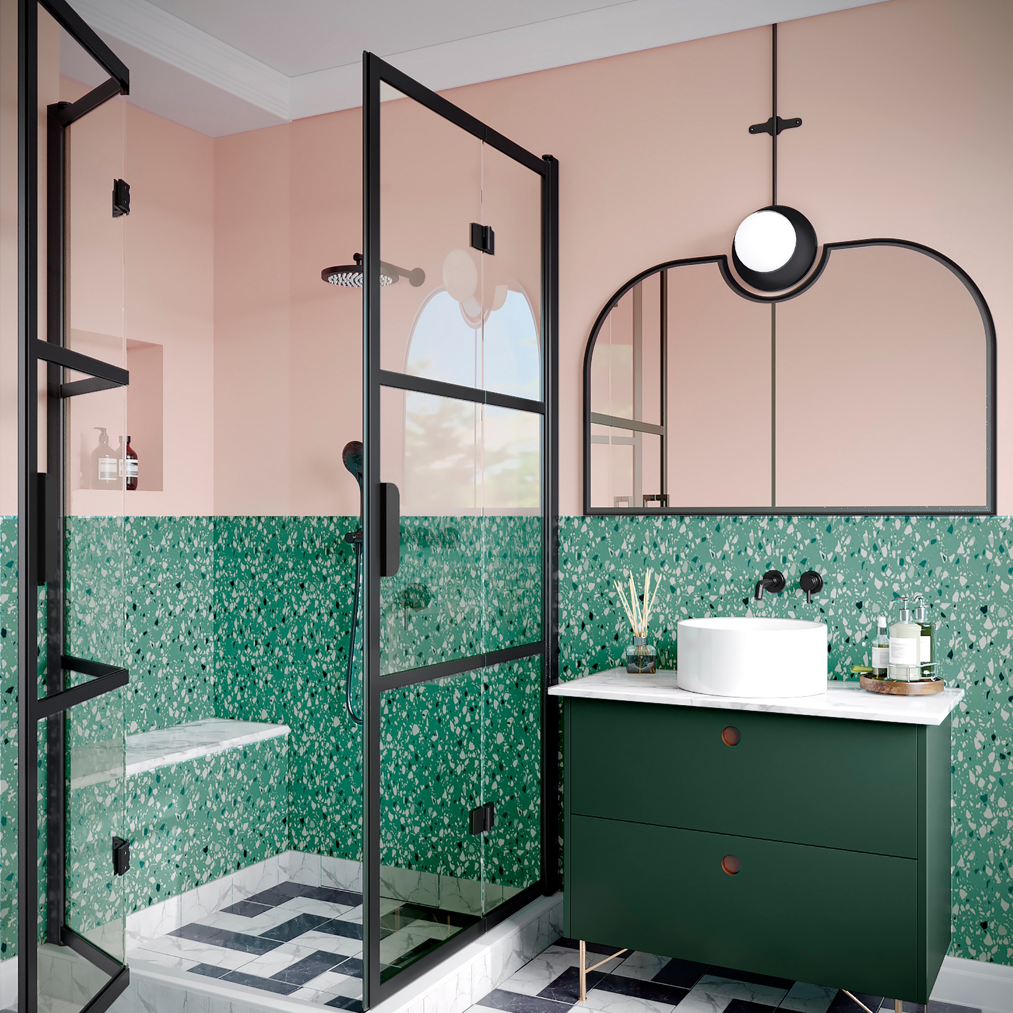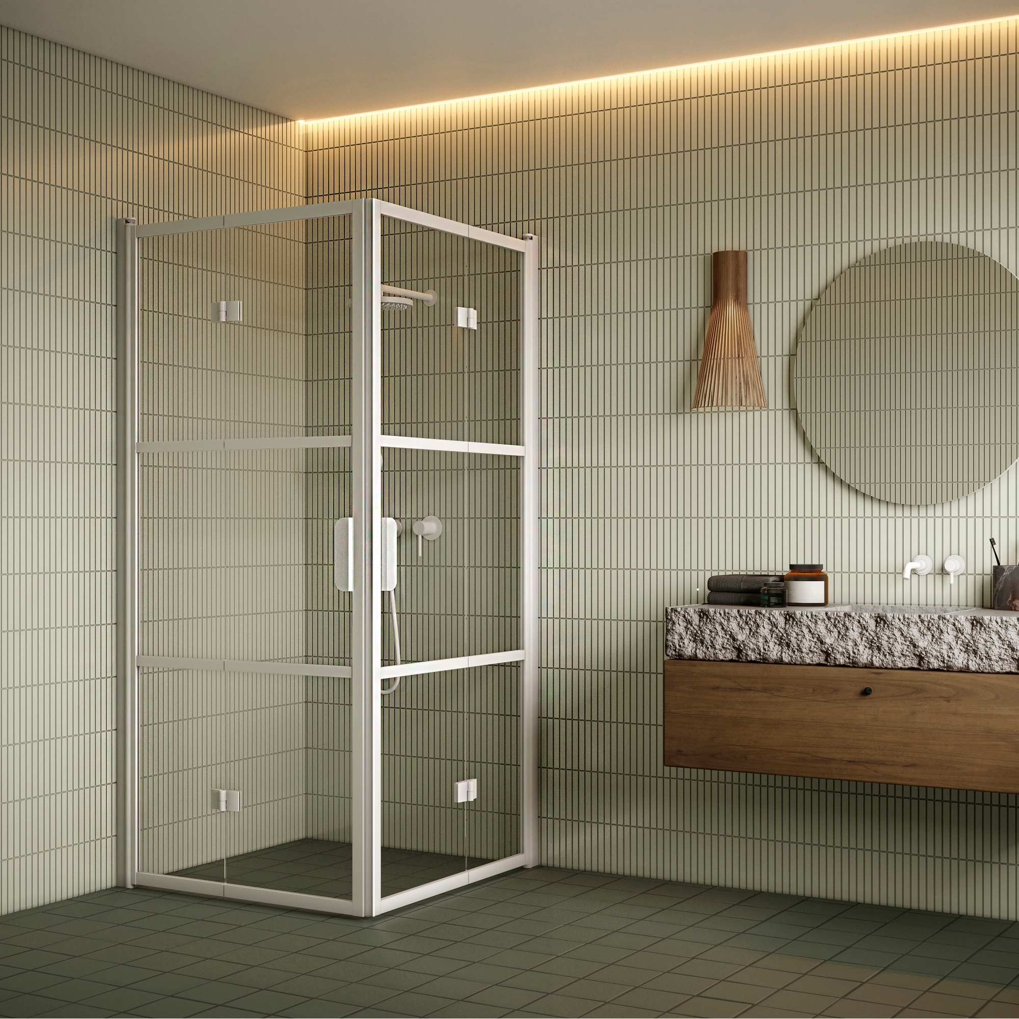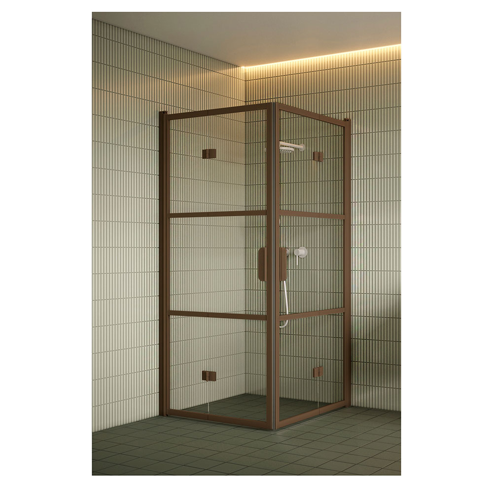 Dörrpanelerna är monterade på byggnadens vägg med väggfästen på vardera sidan av duschhörnan. Släptätning och tröskelprofiler kan installeras under dörrpanelerna för att förbättra vattentätningen. Magnettätning installeras på varje dörröppning för att hålla dörren tätt stängd.