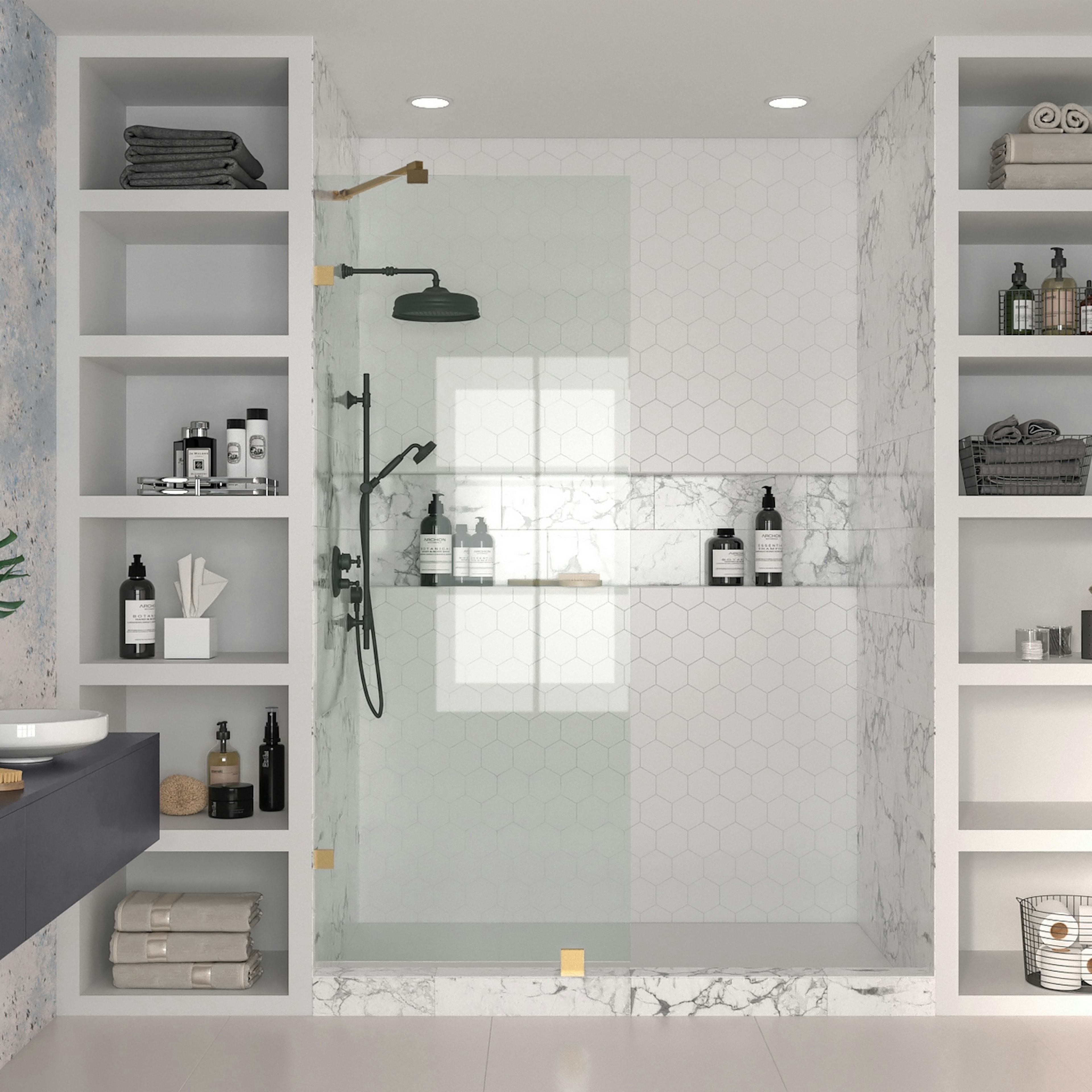 Duschväggen är utrustad som standard med ett snett sidostöd som fästs vid duschväggens övredel. Alternativt kan man välja till ett långt sidostöd, finns att välja som tillval, som kommer i 90 graders vinkel. Denna kan till exempel användas som duschdraperistång.
