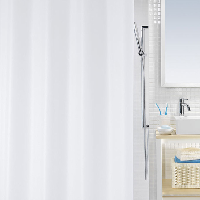 Duschdraperi från Spirella i PVC-fri plast. Duschdraperiet bör tvättas ofta, skölj efter av efter varje användning och låt torka luftigt. Tvättas endast för hand i 30 grader.
