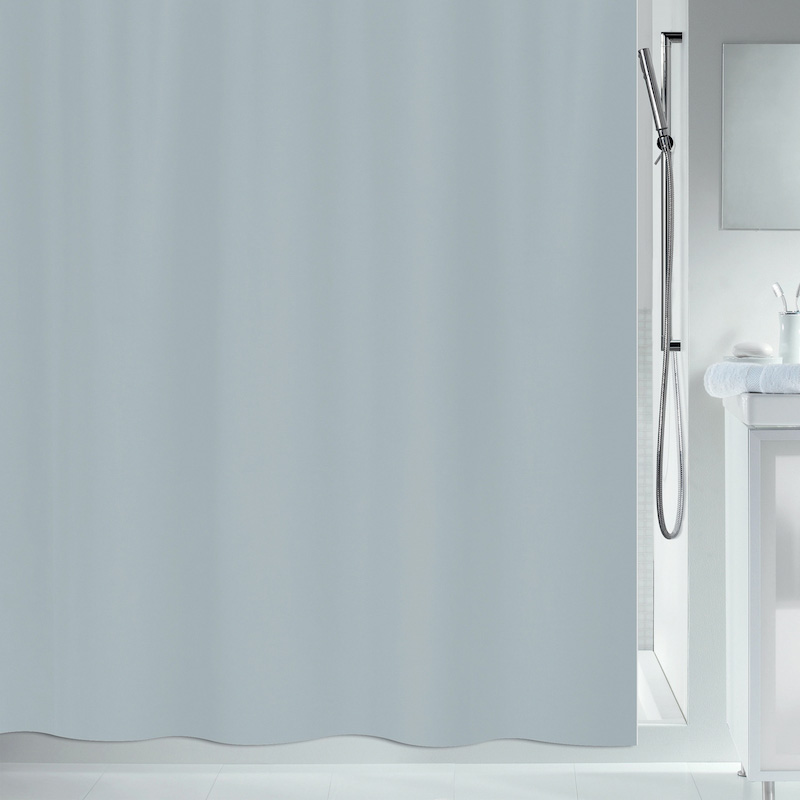 Duschdraperi från Spirella i textil som har ett tyngdband insytt i nederkant för att hålla draperiet på plats när du duschar.